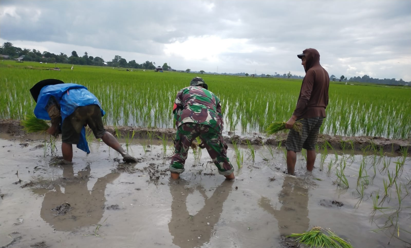 “Ini sudah merupakan tugas kami sebagai aparat kewilayahan membantu para petani dalam hal pertanian, seperti kegiatan tanam padi yang sedang saya kerjakan merupakan wujud kemanunggalan TNI- Rakyat, “ujarnya.
