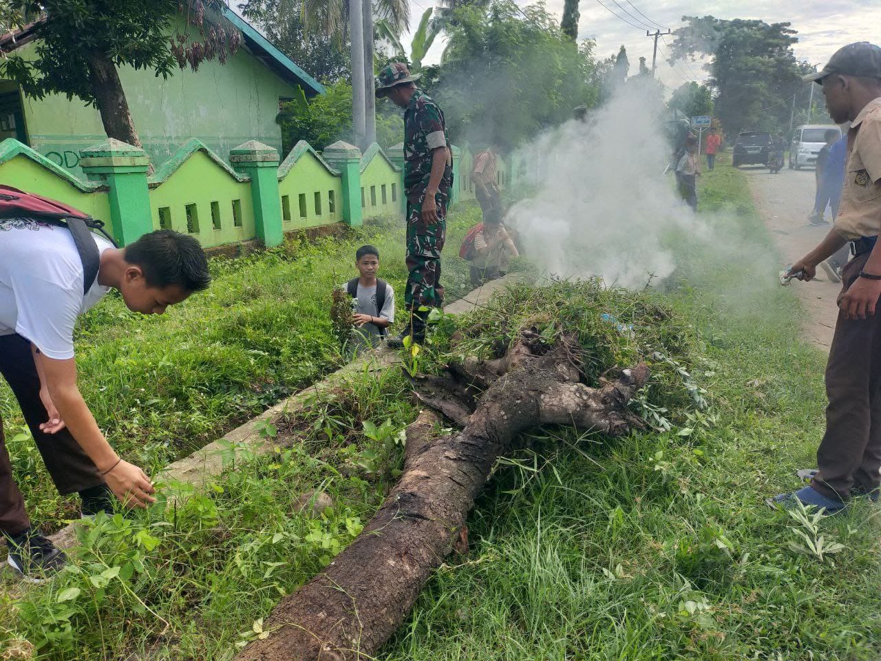 Personel Koramil mengajak warga untuk aktif dan menjadi motivator penggerak masyarakat untuk gotong royong peduli terhadap kebersihan lingkungan. Kegiatan kerja bakti tersebut fokus pada pembersihan bahu jalan yang telah tumbuh rumput liar dan banyak sampah yang mengotori pinggir jalan.