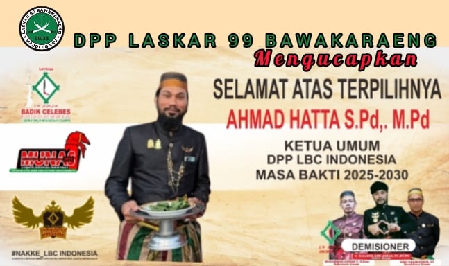 klivetvindonesia.com, Pangkep, 26 Januari 2025 – DPP Laskar 99 Bawakaraeng dengan bangga mengucapkan selamat atas terpilihnya Ahmad Hatta, S.Pd., M.Pd. sebagai Ketua Umum DPP LBC Lembaga Badik Celebes Indonesia masa bakti 2025-2030. Ahmad Hatta terpilih melalui hasil Musyawarah Nasional (Munas) I LBC yang dilaksanakan pada 25-26 Januari 2025 di Sekretariat dan Rujab Kab. Pangkep & Rumah Adat Pangkajene JL Jagong, Kecamatan Pangkajene, Kabupaten Pangkajene dan Kepulauan, Sulawesi Selatan.