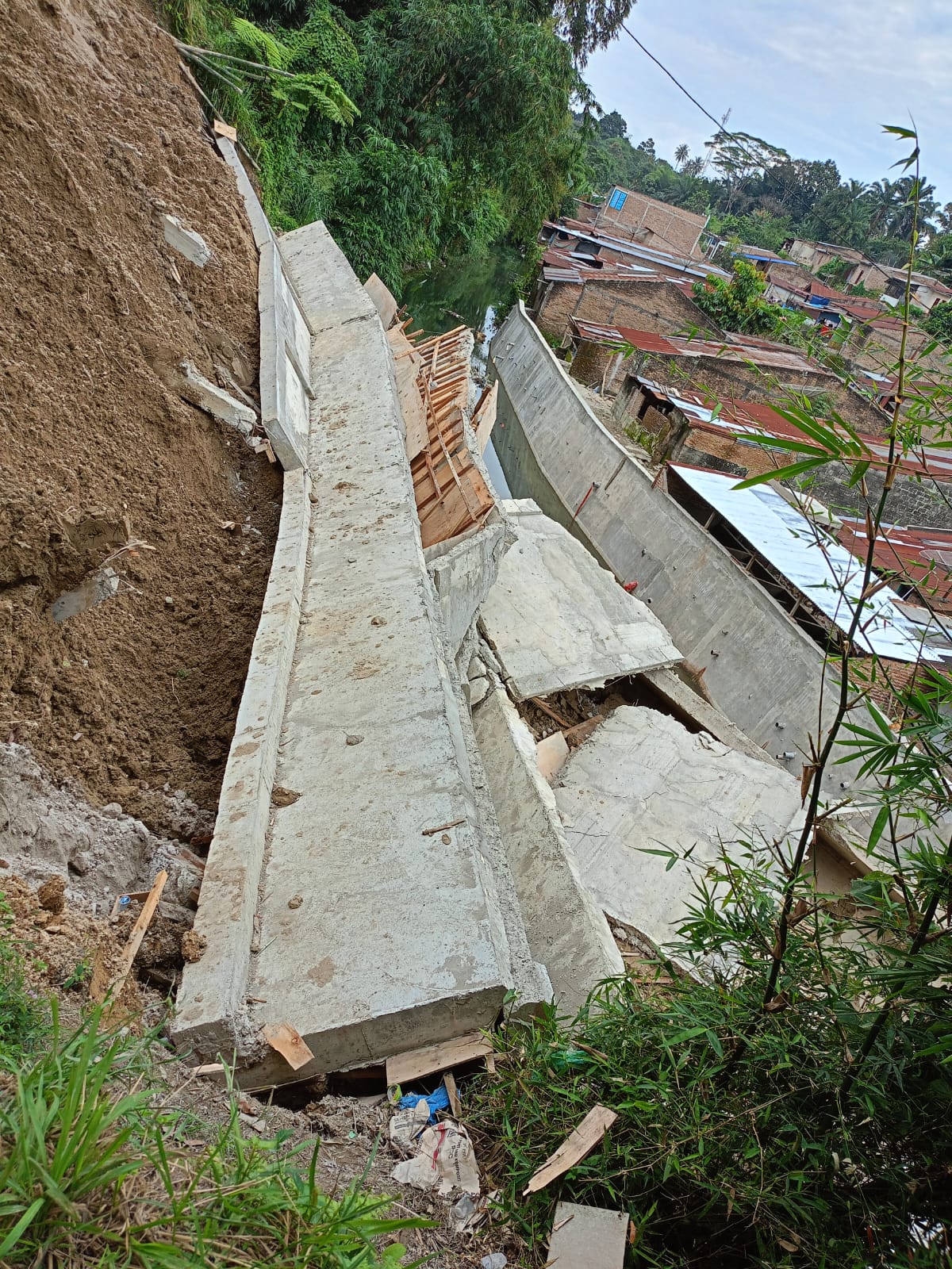 Itu planknya sembari menunjuk kearah runtuhan tembok penahan tertimpa TPT, tegas si Ibu tersebut. Karena tanah ini labil sebaiknya yang dibangun disini bronjong lebih kuat tahan air dan tahan longsor. Menjawab pertanyaan Wartawan, kemarin runtuhnya tembok sekira tengah hari (Senin, 20/1/’25), imbuhnya.