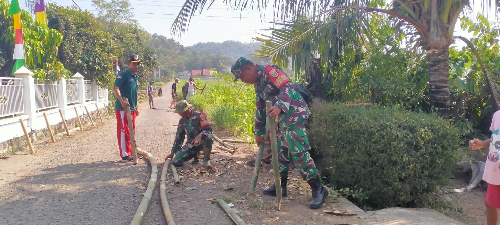 Hari ini kita bersama-sama masyarakat bahu membahu bergotong royong membuat rambu jalan di lingkungan desa supaya terlihat rapih dan terkesan terawat sehingga nampak indah, tentu nya kami sebagai aparat kewilayahan mengidukasi kembali budaya gotong royong,”ujar Sertu Sugiyanto