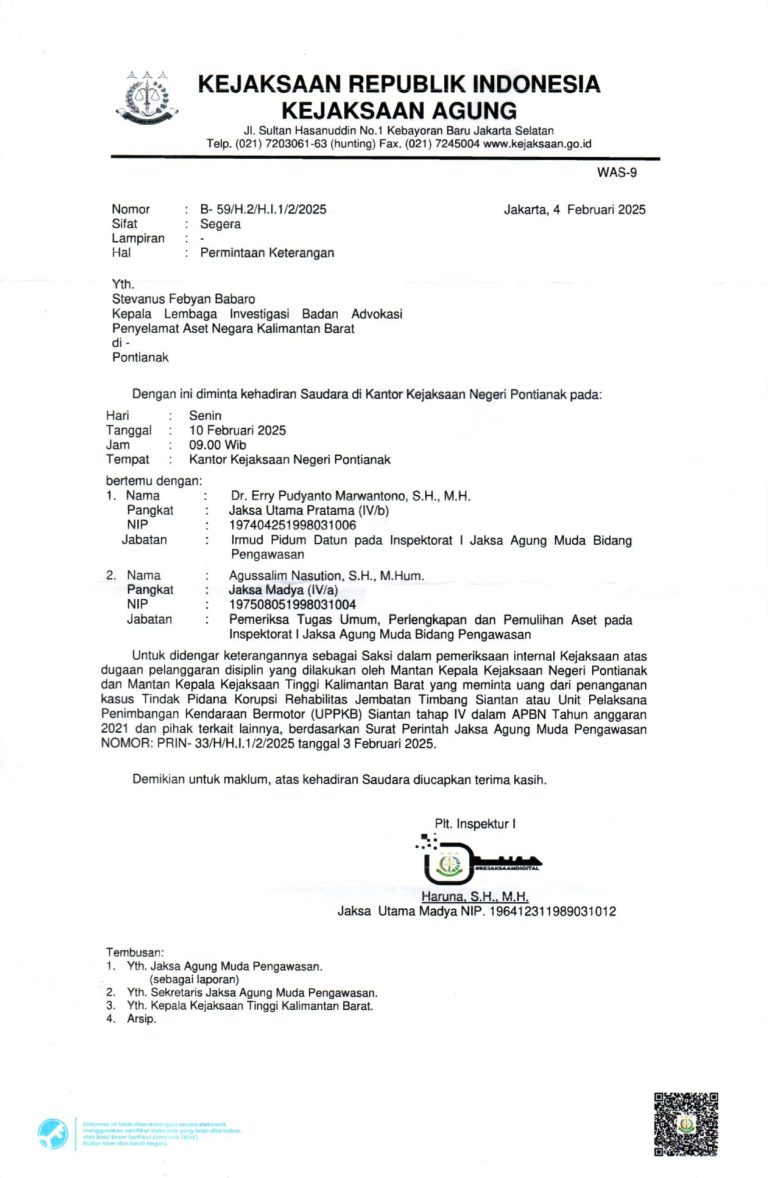 Klivetvindonesia.com, Pontianak – Kejaksaan Agung RI lewat surat resminya nomor : B-59/H.2/H.I.1/2/2025 yang’ ditandatangani Plt. Inspektur 1, Jaksa Utama Madya, Haruna S.H.M.H, meminta Ketua LIBAPAN Kalimantan Barat, Setevanus Febyan Babaro, untuk hadir di Kantor Kejaksaan Negri Pontianak pada hari senin tanggal 10 Februari 2025 pukul 09.00 Wib.