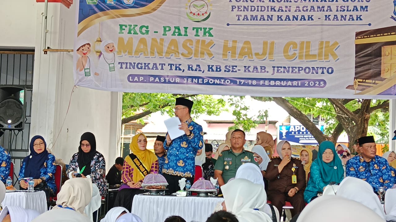 klivetvindonesia.com, Jeneponto, 17 Februari 2025 – Forum Komunikasi Guru Pendidikan Agama Islam Taman Kanak-Kanak (FKG PAI TK) Kabupaten Jeneponto sukses menggelar kegiatan Manasik Haji Cilik, yang diikuti oleh 2.484 anak-anak usia dini dari TK, RA, dan KB se-Kabupaten Jeneponto. Kegiatan ini berlangsung di Lapangan Pasamaturukan dan dibuka secara resmi oleh Penjabat (Pj) Bupati Jeneponto, H. Reza Faisal Saleh.