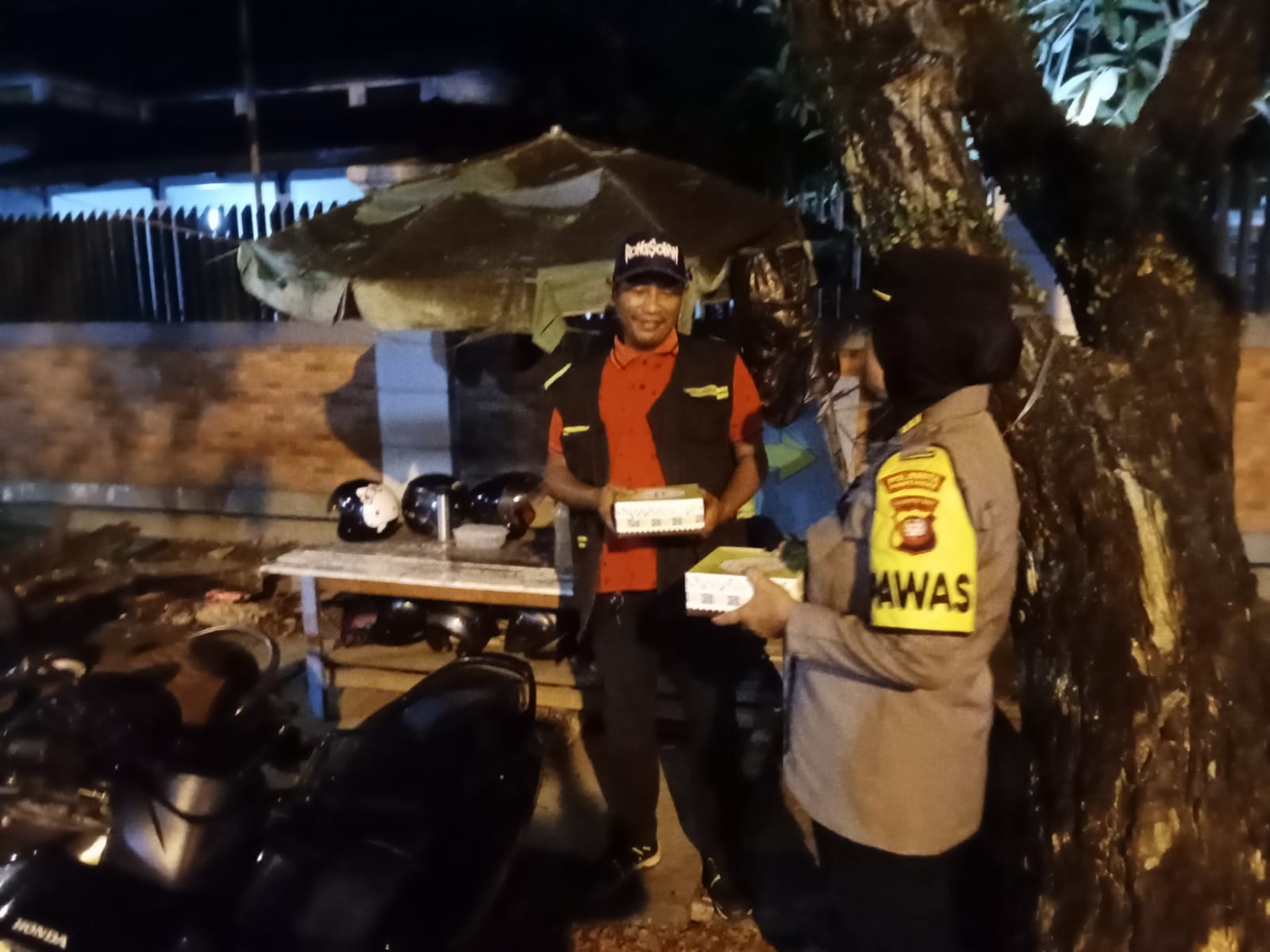 Selain memberikan himbauan Kamtibmas, petugas juga menyalurkan sarana kontak berupa nasi kotak kepada petugas jaga malam , petugas parkir dan masyarakat yang melakukan aktifitas pada malam hari sebagai bentuk dukungan terhadap pengamanan swakarsa di lingkungan masyarakat.