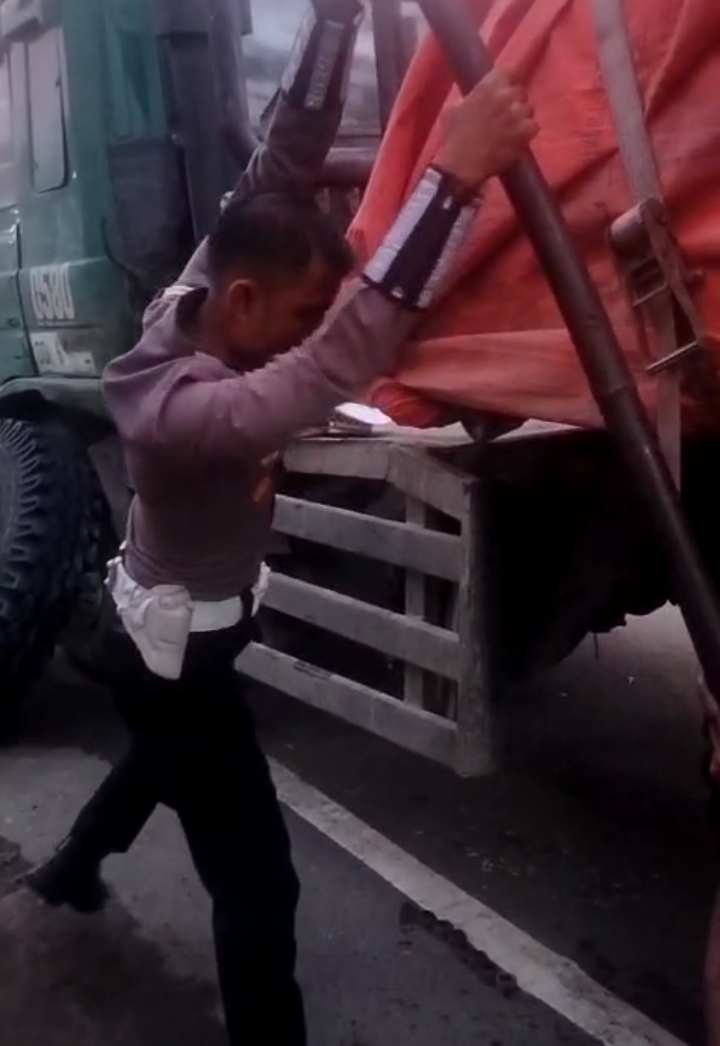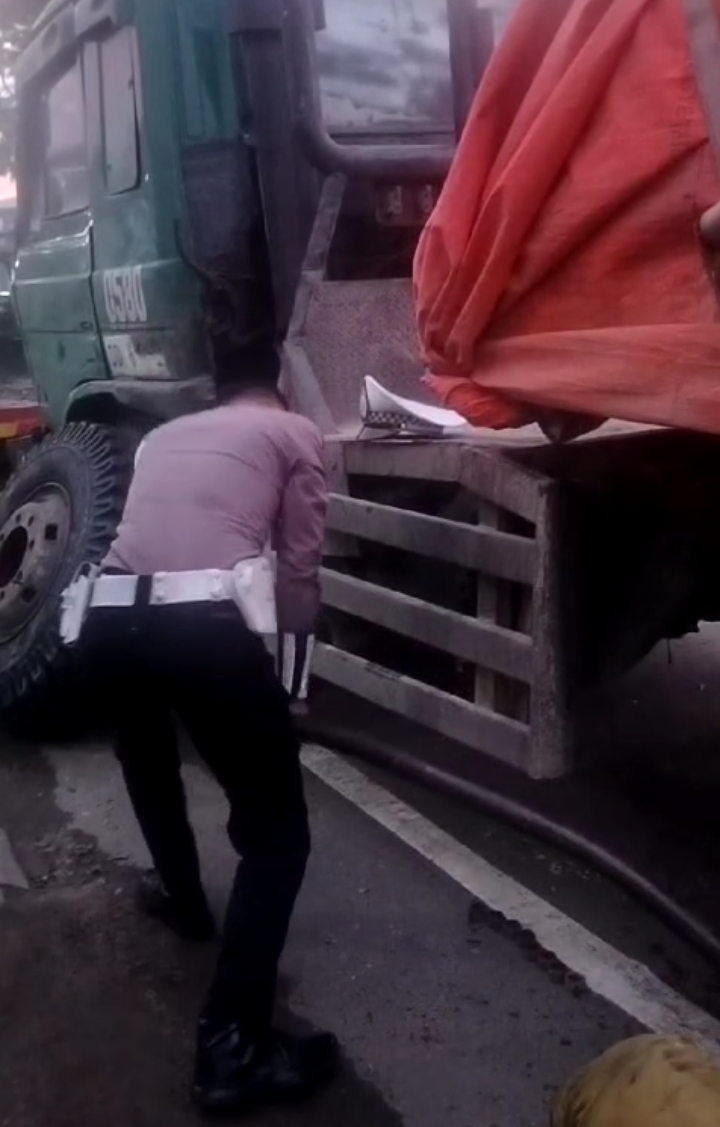 Insiden tersebut menarik perhatian warga yang melintas, karena anggota Polantas tersebut terlihat secara langsung membantu memasang ban truk yang rusak.