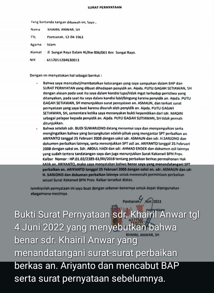 “Fakta-fakta yang ada jelas menunjukkan bahwa ini adalah perbaikan administrasi, bukan pemalsuan surat. Bukti-bukti ini seharusnya menjadi pertimbangan hukum yang kuat bagi Majelis Hakim PN Mempawah,” tegas Ervan.