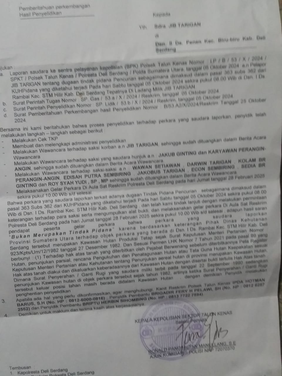 Trinov Fernando Sianturi, SH, telah mengirim surat resmi ke Kapolsek Talun Kenas pada November 2024, namun hingga Maret 2025, tidak ada tanggapan dari pihak kepolisian. Kliennya pun baru-baru ini menerima SP2HP (Surat Pemberitahuan Hasil Penyidikan) dari Polsek Talun Kenas yang menyatakan bahwa kasus pencurian kayu tersebut bukan merupakan tindak pidana. Alasannya, tanah tempat kejadian dianggap sebagai milik negara atau hutan negara, meskipun klien memiliki surat ganti rugi yang ditandatangani oleh Kepala Desa Jakobus Tarigan dan diketahui oleh Camat STM Hilir sejak tahun 1990.
