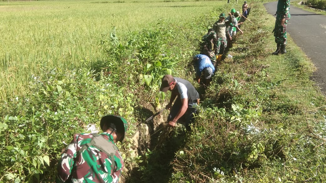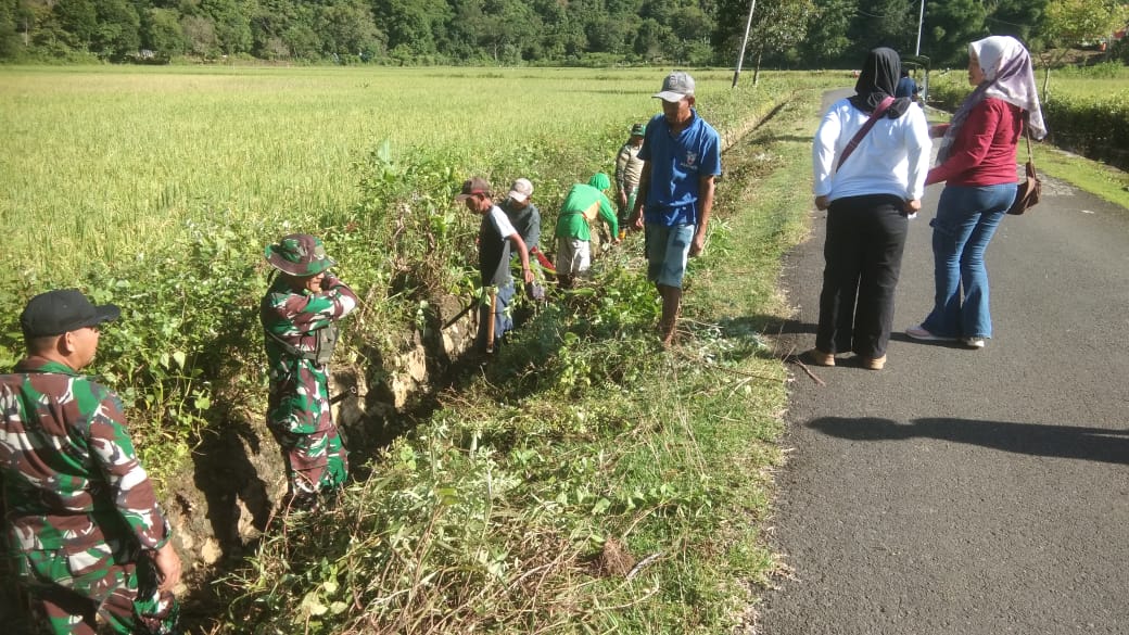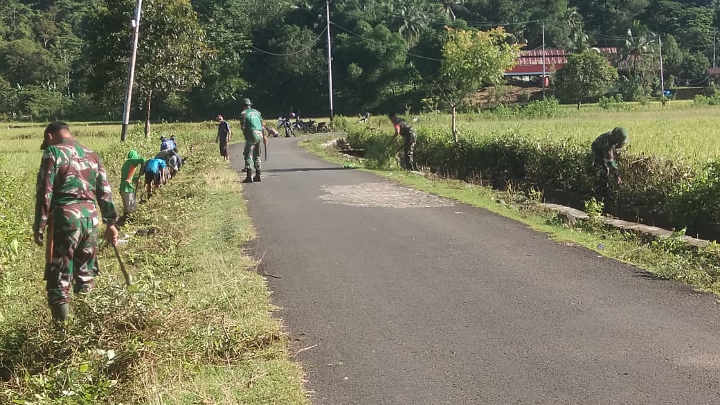 secara gotong royong. Warga bersama Babinsa bahu-membahu membersihkan Jalan dan selokan