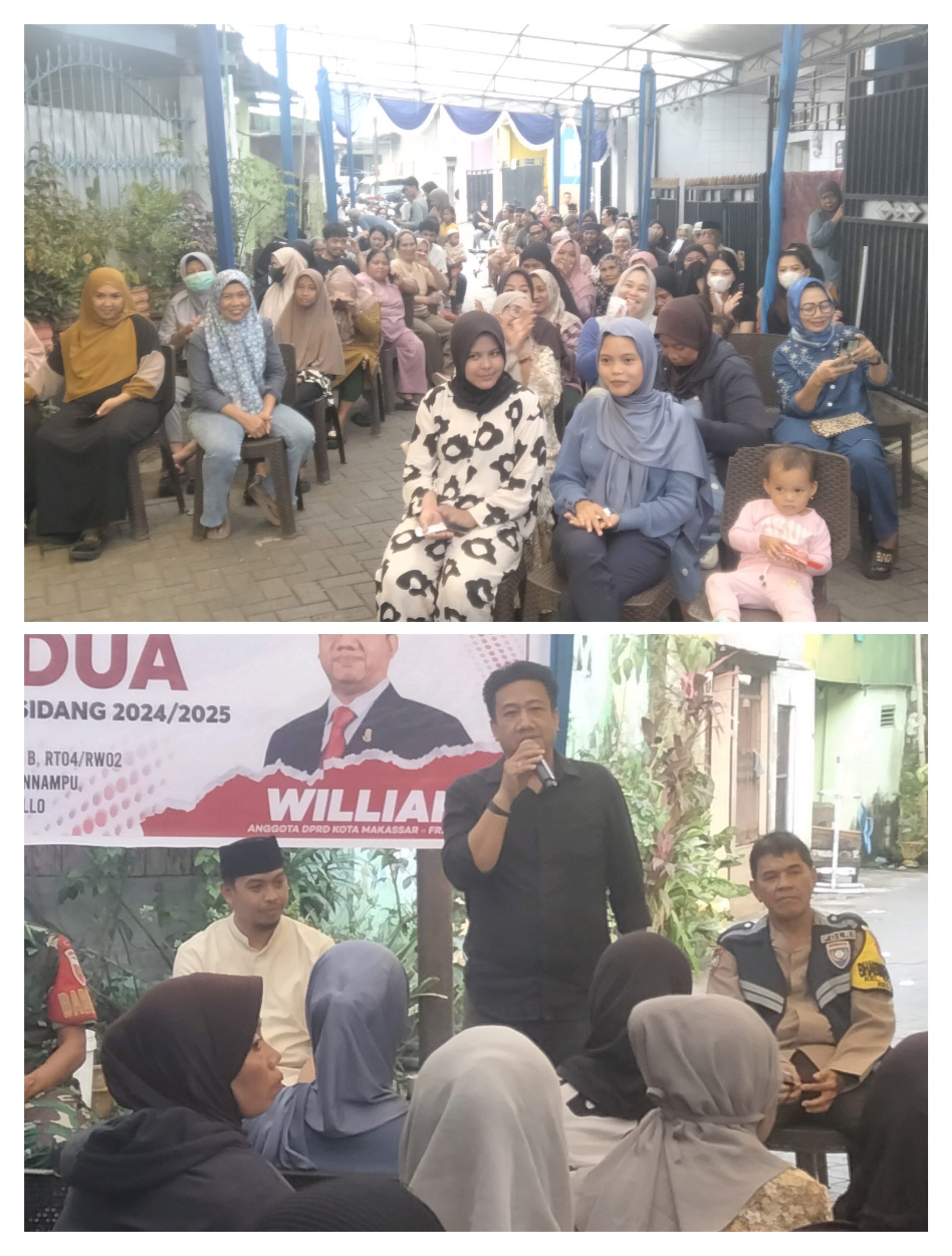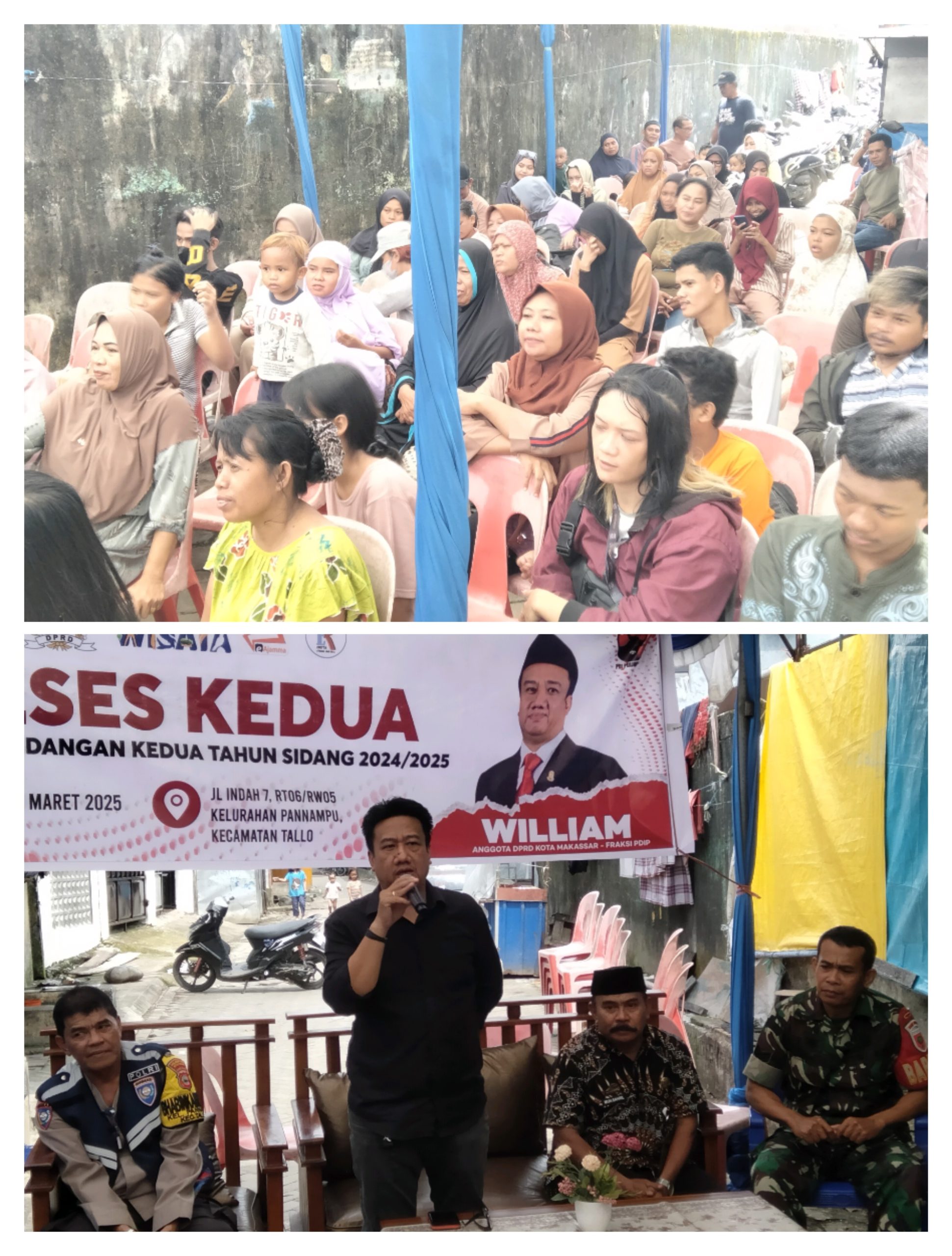 Makassar, Klivetvindonesi.com- 13 Maret 2025 – Anggota DPRD Kota Makassar dari Fraksi PDIP Perjuangan, William, mengadakan reses pada masa persidangan kedua tahun 2024/2025 di dua lokasi berbeda di Kelurahan Pannampu, Kecamatan Tallo. Reses pertama dilaksanakan di Jl Indah 7, RT06/RW05 pada pukul 12.00 WITA, diikuti dengan reses kedua di Jl Tinumbu 66 B, RT04/RW02 pada pukul 15.00 WITA.