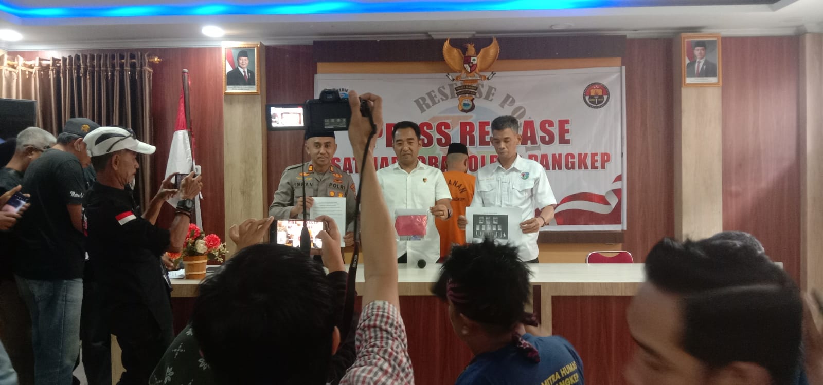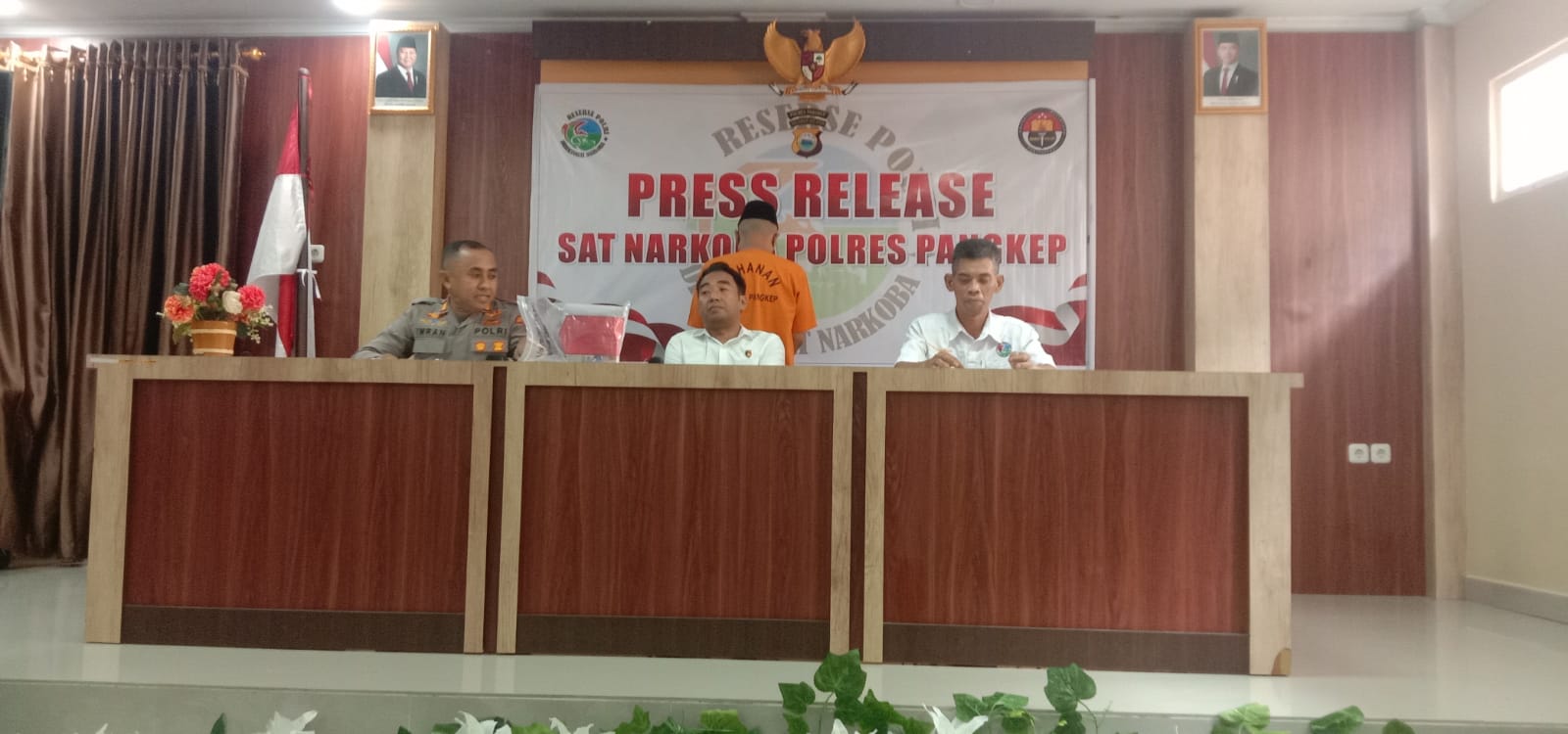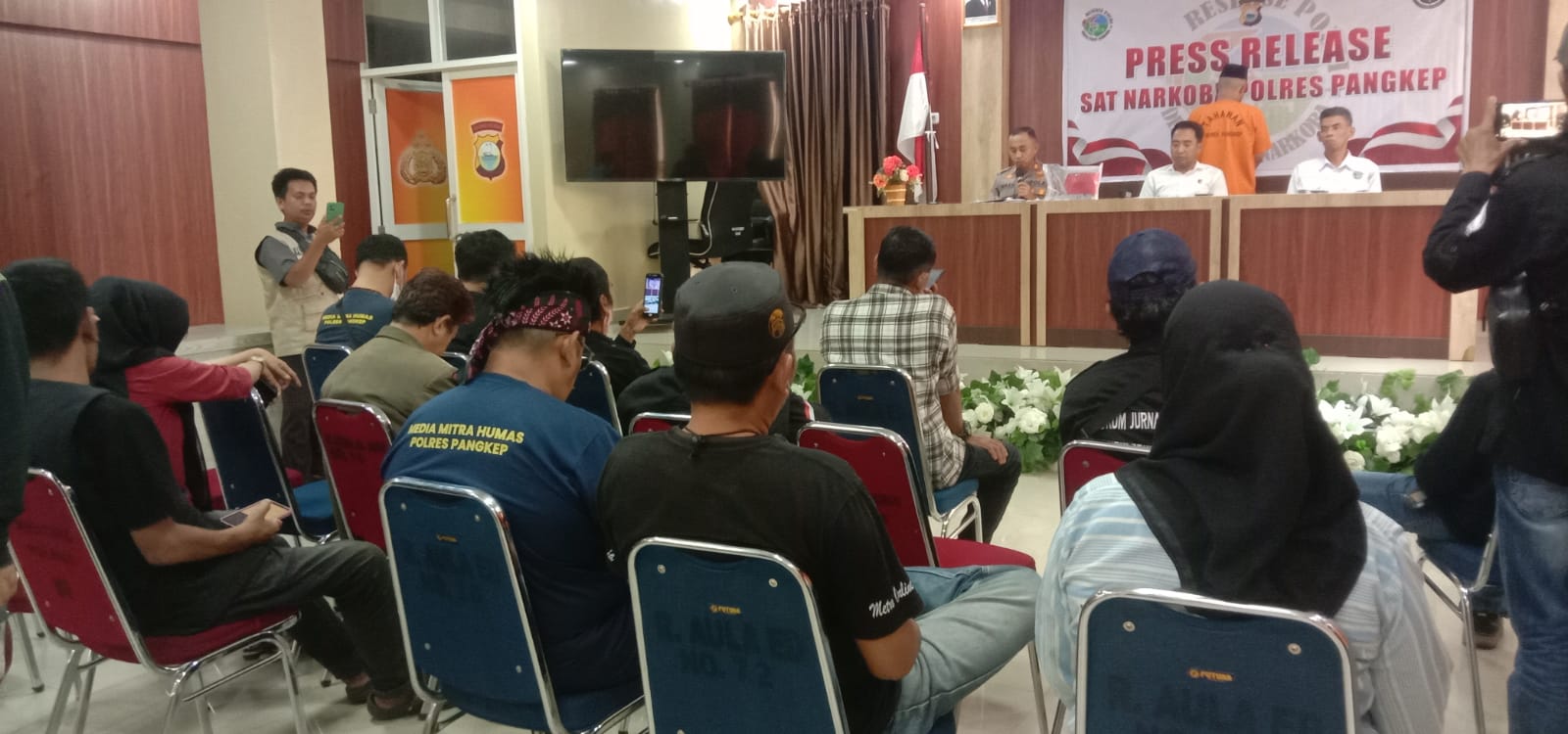 Konferensi pers ini dipimpin oleh Kasat Resnarkoba Polres Pangkep, IPTU Hasru S., S.O.S., didampingi Kasih Humas Polres Pangkep, AKP Imran, serta KBO Sat Resnarkoba, IPDA Rusliadi, S.H. Acara ini turut dihadiri oleh sejumlah anggota kepolisian yang terlibat dalam pengungkapan kasus, serta awak media yang meliput di Aula Polres Pangkep.