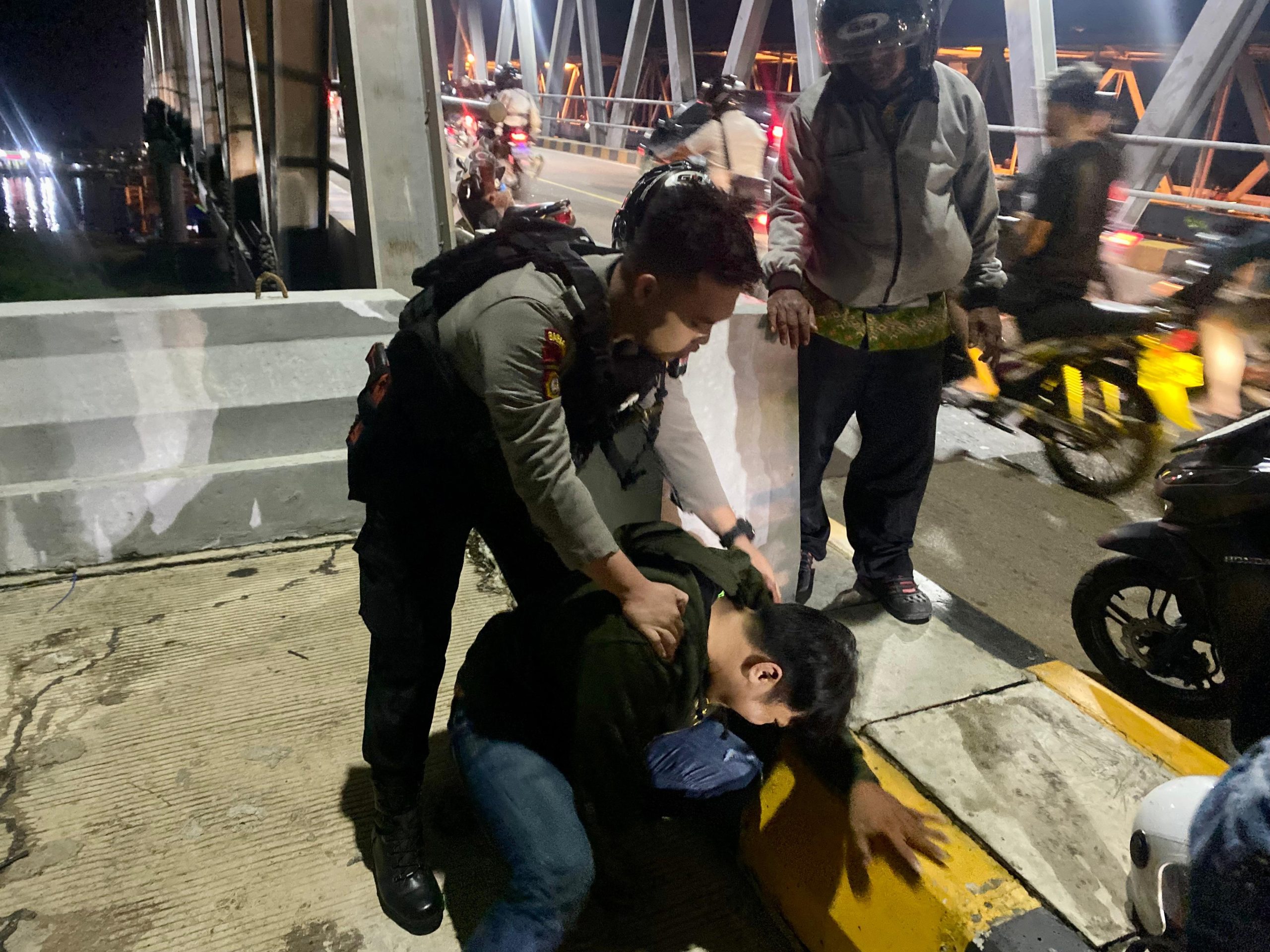 Pada saat bersamaan, Bripda Heru, anggota Unit Patroli Subdit Gasum, melintas di lokasi kejadian dan melihat pria tersebut berdiri di pinggir jembatan dalam posisi hendak melompat. Dengan cepat dan sigap, Bripda Heru langsung merangkul pria itu dan menggagalkan aksinya.