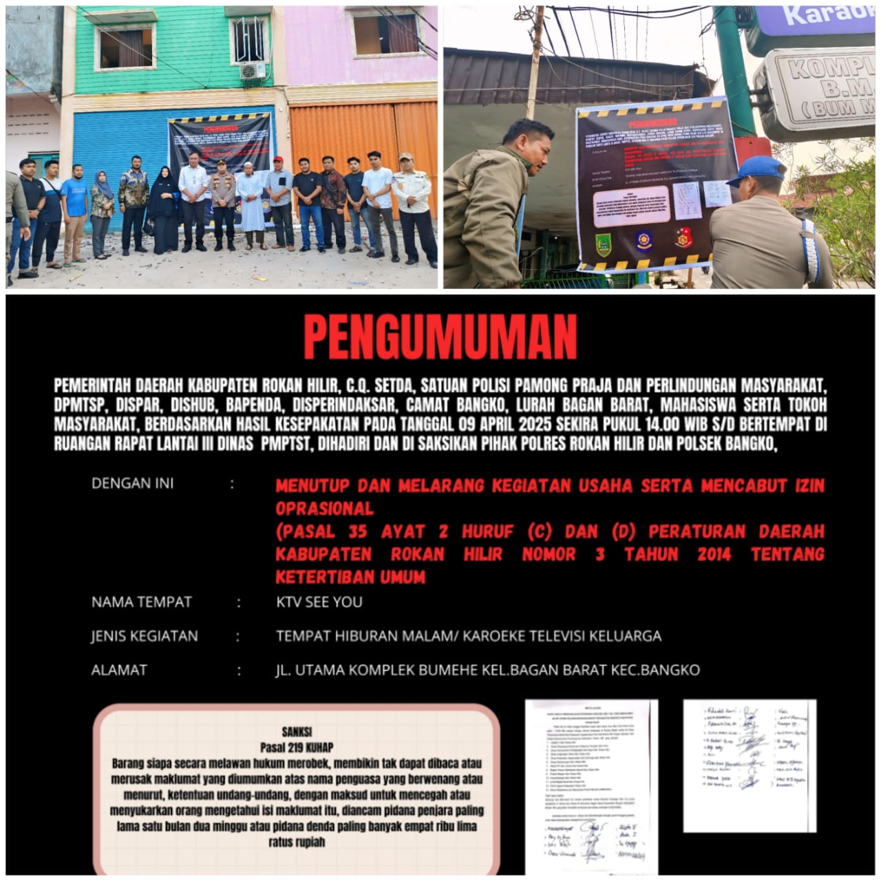 Klivetvindonesia.com Bagansiapiapi – Pemerintah Kabupaten Rokan Hilir melalui Satuan Polisi Pamong Praja (Satpol PP), bersama jajaran lintas instansi, secara resmi menyegel dan mencabut izin operasional tempat hiburan malam ‘KTV See You’ di Jalan Utama, Kelurahan Bagan Barat, Kecamatan Bangko, Kamis (10/4/2025).