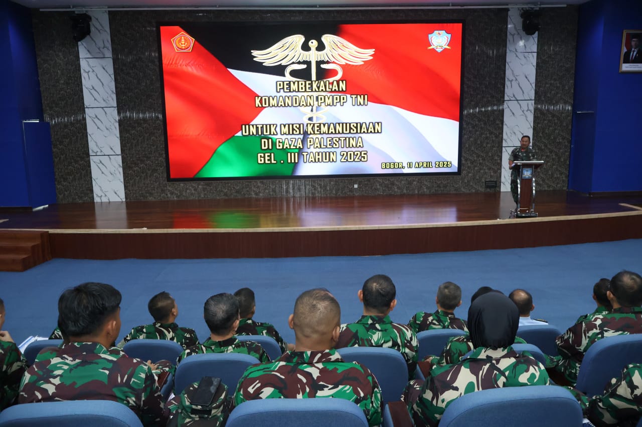 Komandan PMPP TNI Mayjen TNI Taufik Budi Santoso, S.Hub.Int., M.H.I. mengucapkan selamat datang kepada para peserta pembekalan Tenaga Kesehatan TNI Gelombang III yang akan dikerahkan sebagai tenaga kesehatan di Gaza Palestina TA 2025. Kegiatan ini berlangsung selama 3 hari mulai tanggal 11 s.d. 13 April 2025 dan diikuti oleh 25 personel tenaga kesehatan TNI yang terdiri dari 3 matra TNI dimana didalamnya terdapat 3 Wan TNI, team ini akan bertugas selama krg lbh 3-4 bln.