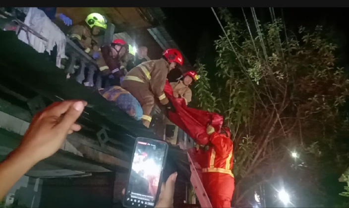 “Korban kami temukan di lantai dua, di dalam kamar. Kami evakuasi lewat depan karena akses tangga dalam rumah sempit dan agak berdiri,” ujar Komandan Regu Pemadam Kebakaran, Ramli, dari Danton 1.