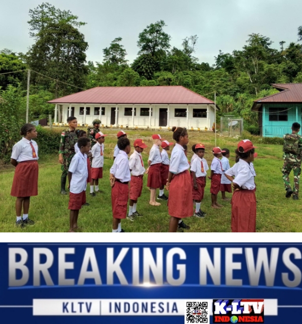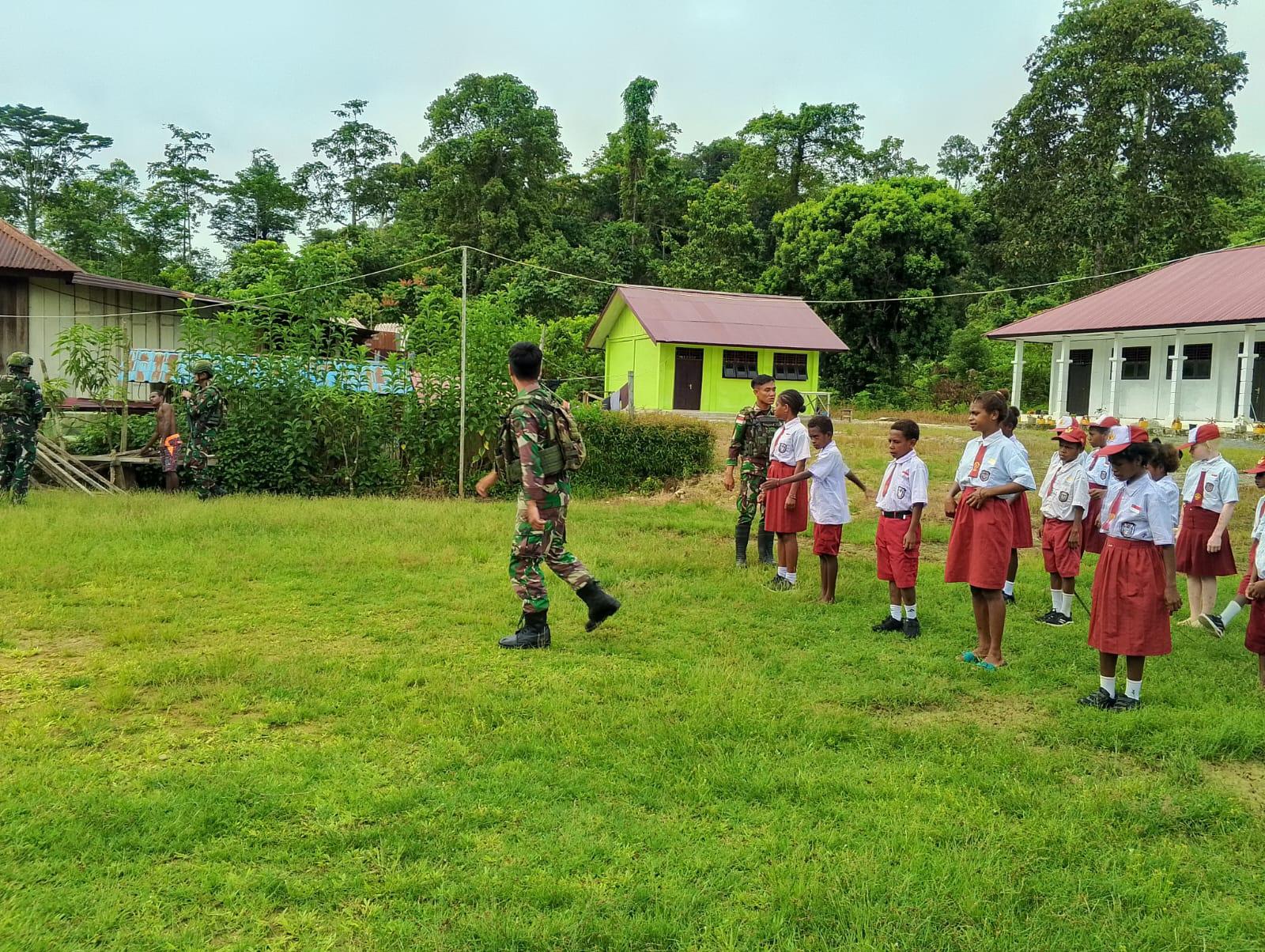 –klivetvindonesia.com– Teluk Bintuni – Satgas Pamtas Kewilayahan Yonif 642/Kps Pos Masyeta personil pos memberikan latihan baris berbaris kepada siswa SD Inpres Masyeta, distrik Masyeta, Kabupaten Teluk Bintuni, Papua Barat. (12/5/2025)