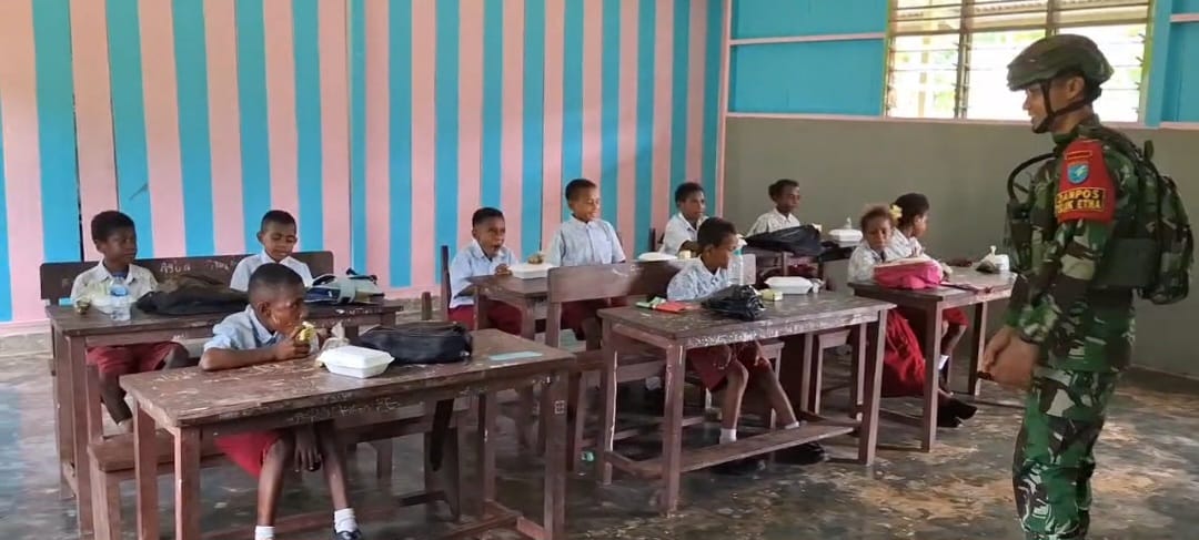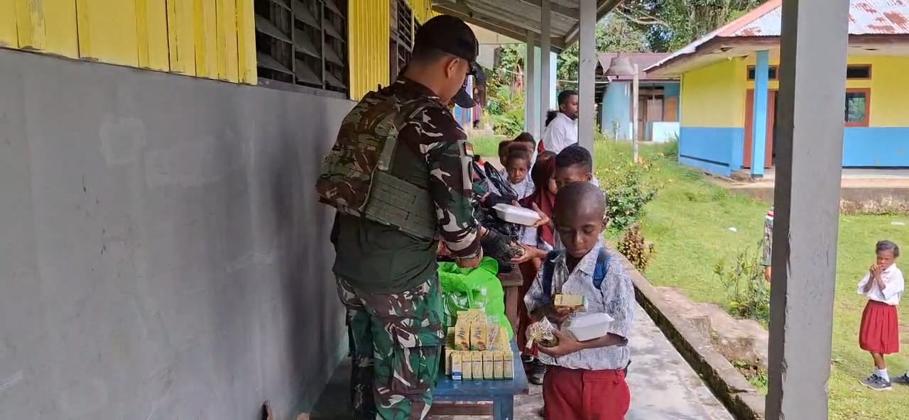 Personil pos Teluk Etna membagikan makanan bergizi gratis agar kegiatan belajar mengajar dapat di laksanakan dengan baik, Masyarakat juga berharap agar kegiatan makan bergizi gratis di SD negeri 1 Teluk Etna dapat selalu terlaksana untuk memenuhi kebutuhan gizi bagi anak anak sekolah dasar di wilayah distrik Teluk Etna. (Pen Yonif 642/Kps)
