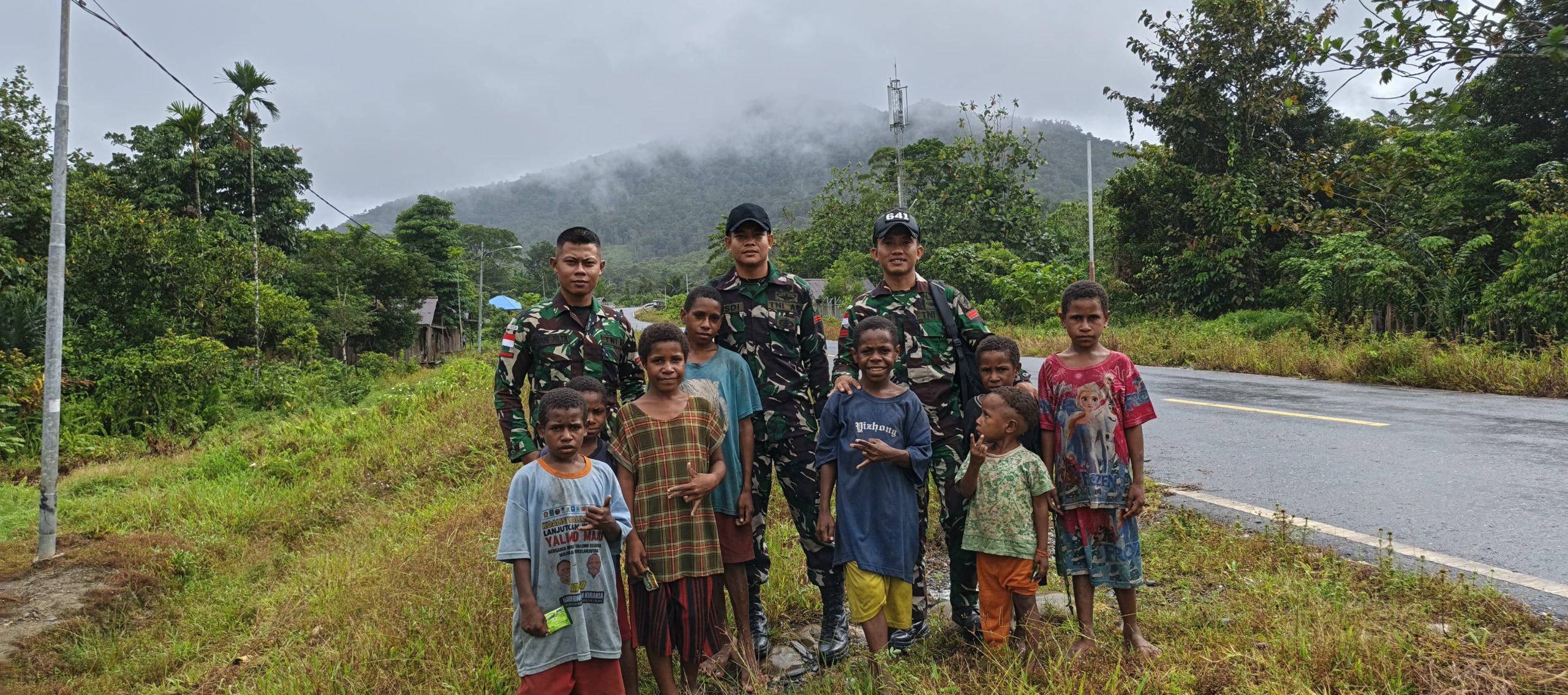 Anggotal Pos Benawa yang dipimipin Serda Rahmat sudah familiar di mata anak-anak sebab seringnya interaksi dengan mereka. Tak jarang anak-anak bercerita dengan Abang-abang TNI tentang masa kecil mereka. Ditengah-tengah obrolan mereka, kami hadiahkan mereka makanan ringan atau hanya sekedar permen untuk menemani hari mereka.