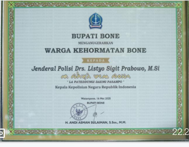 Gelar adat Bugis tersebut diberikan sebagai bentuk penghargaan atas dedikasi dan kontribusi besar Kapolri dalam menjaga stabilitas keamanan nasional, sekaligus dukungan aktif terhadap pembangunan sektor pertanian dan ketahanan pangan di tanah air.