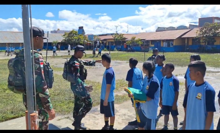 Jayawijaya – Pos Napua dalam membangun rasa kebersamaan dan meningkatkan rasa cinta tanah air, personel Pos Napua mengajarkan tata cara upacara bendera kepada siswa – siswi SMP NEGERI 1 Wamena yang berada di Jl.SD Percobaan, Wamena kota, Distrik Wamena, Kabuapaten Jayawijaya, Papua Pegunungan. (17/05/2025).