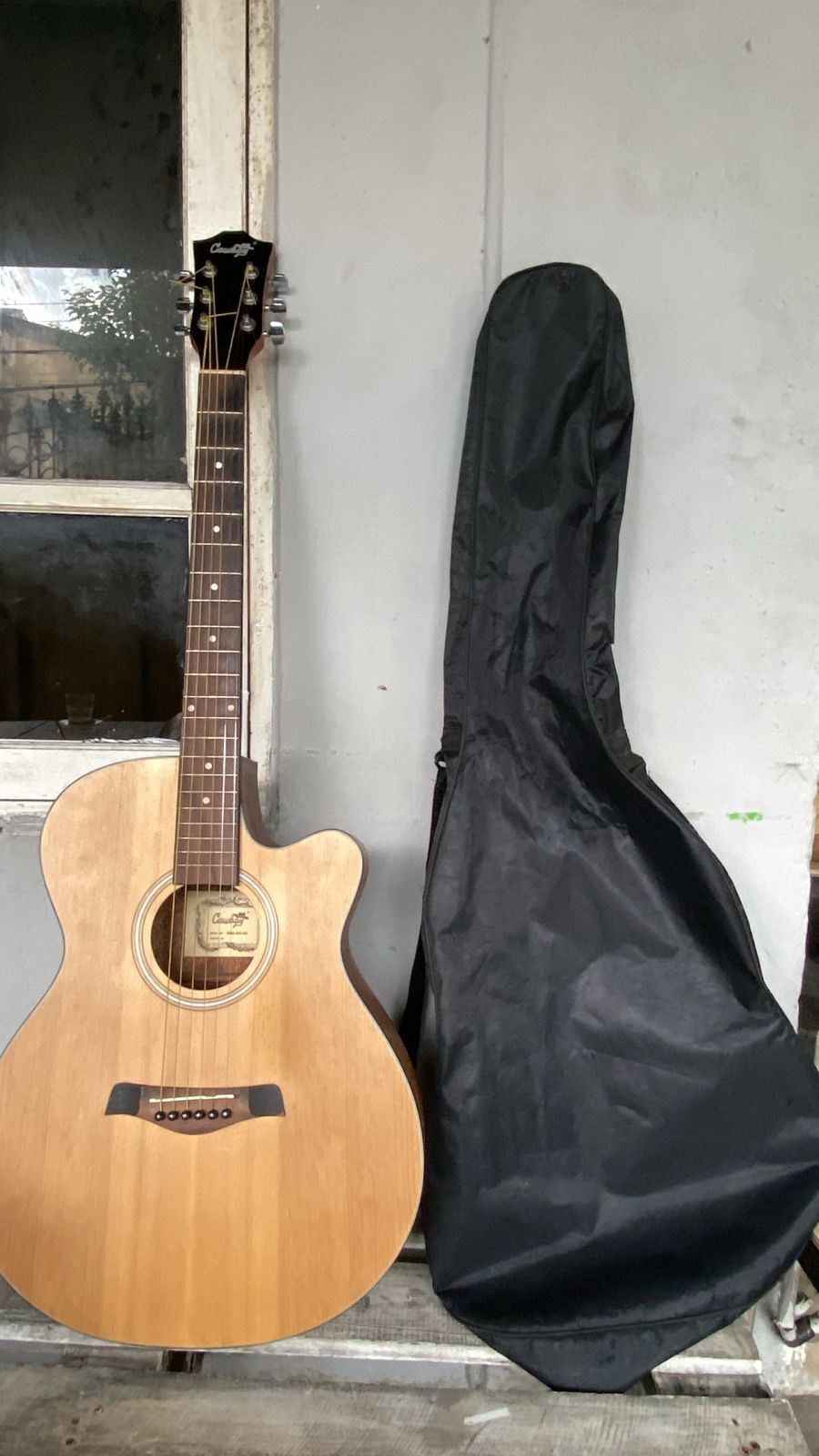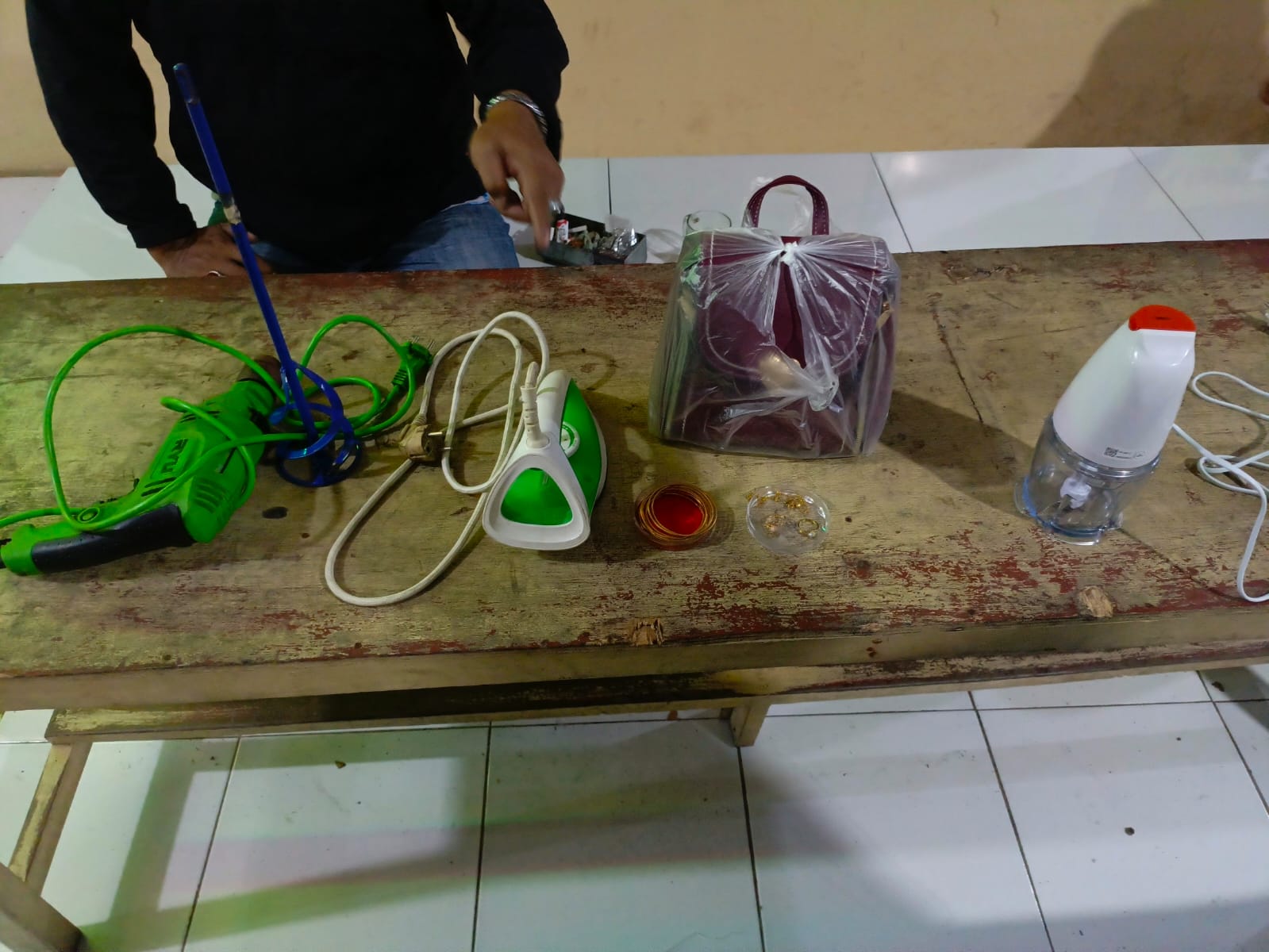 1 gitar akustik koboi, 1 tas kulit, 1 bor listrik RYU, 1 setrika, 1 gelang emas