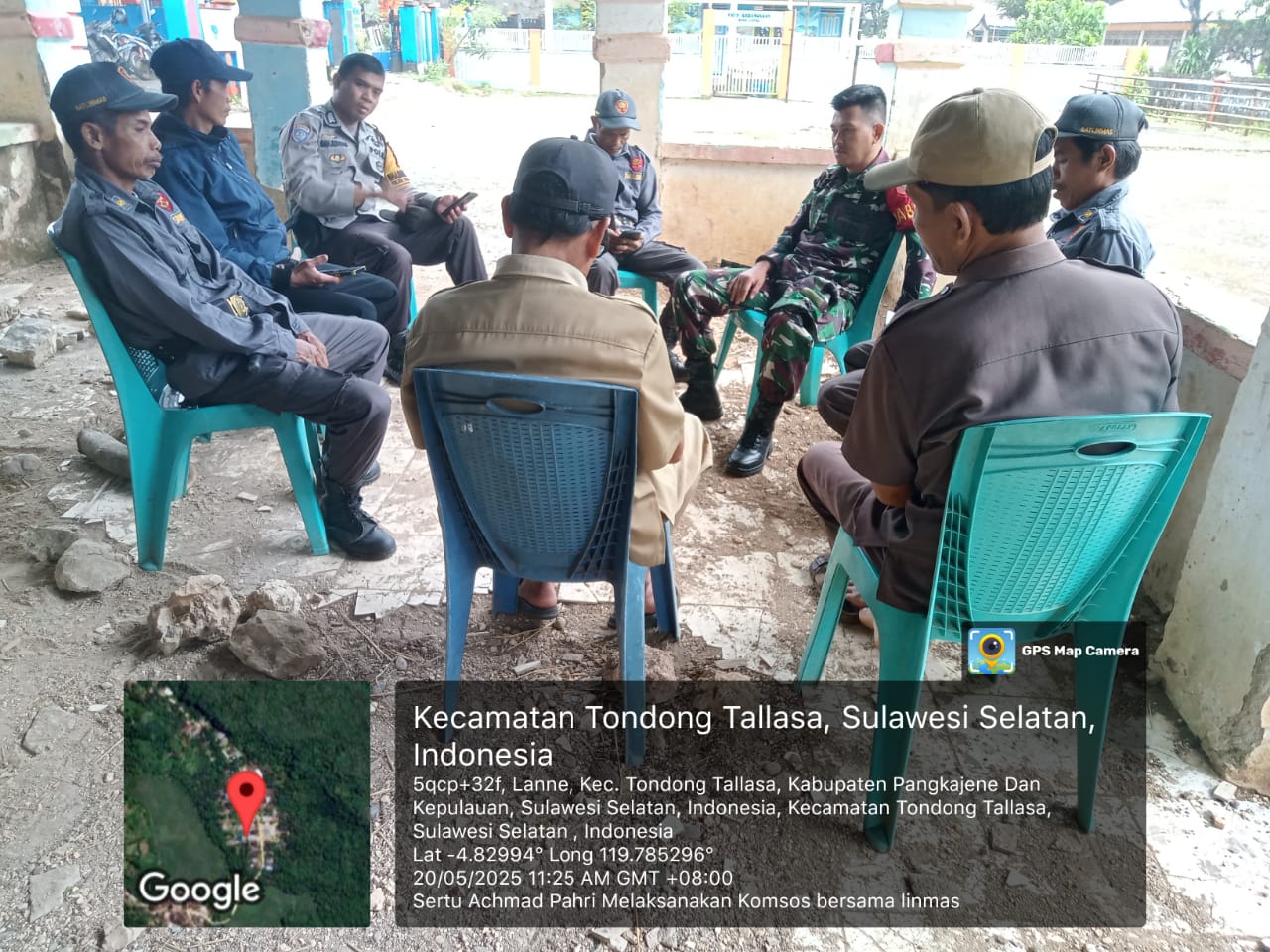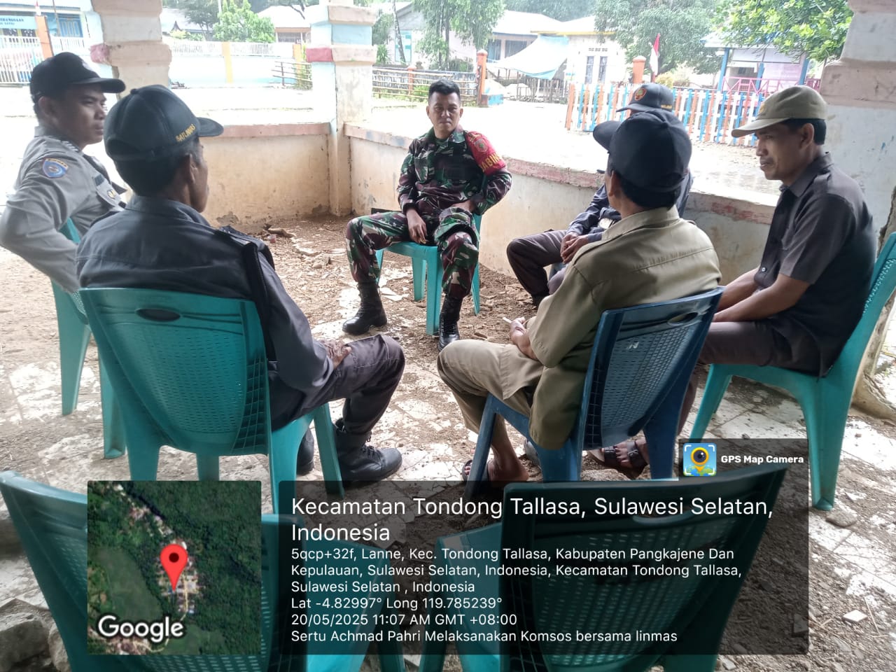 klivetvindonesia.com, Pangkep Selasa, 20 Mei 2025 pukul 10.32 WITA, Sertu Achmad Pahri selaku Babinsa Desa Lanne melaksanakan kegiatan Komunikasi Sosial (Komsos) bersama Bhabinkamtibmas dan anggota Linmas di RT 01, RK 01, Dusun Maccini, Desa Lanne, Kecamatan Tondong Tallasa, Kabupaten Pangkep.