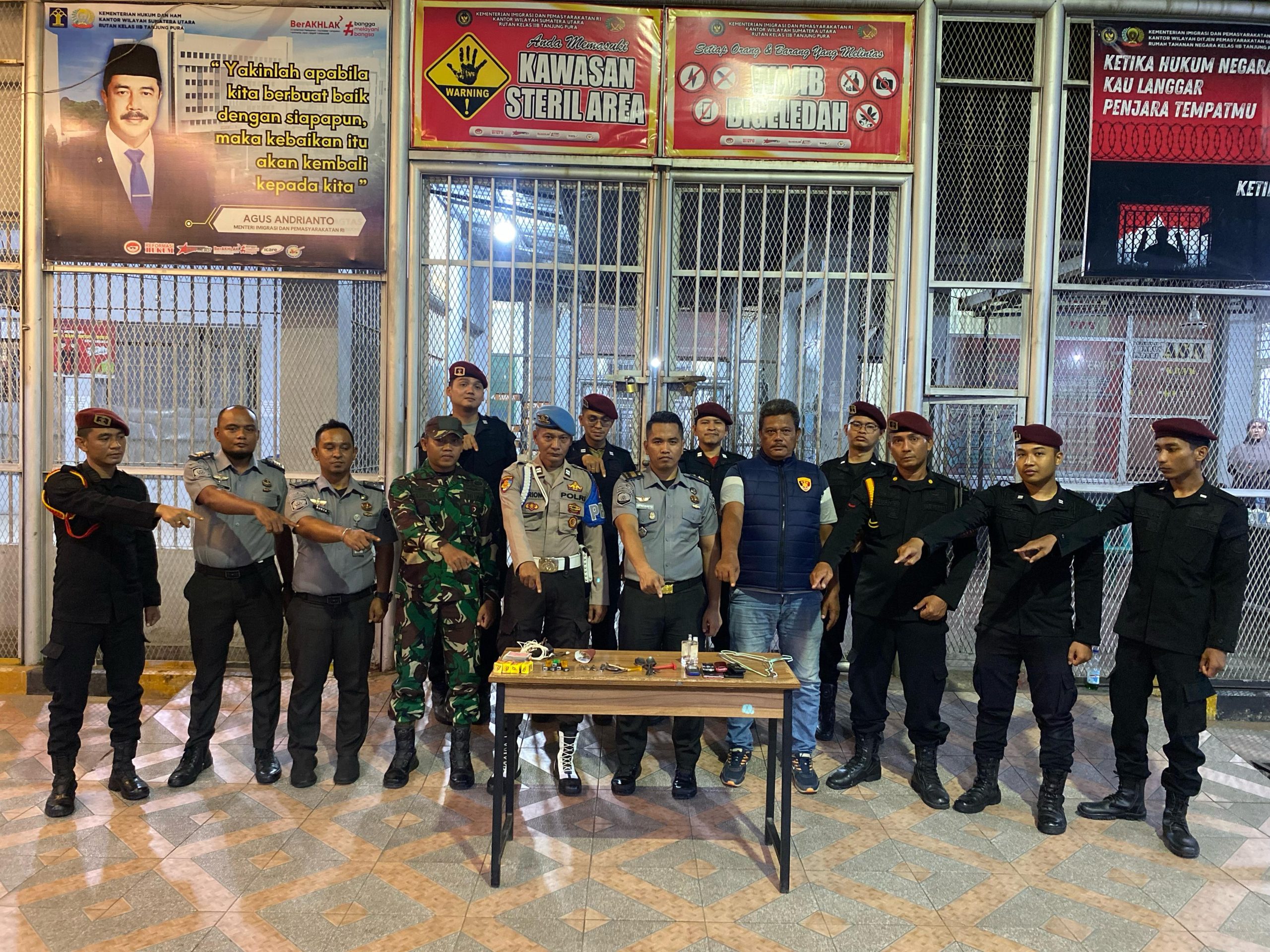 Hingga pukul 20.00 WIB razia gabungan dilaksanakan, petugas berhasil mengamankan sejumlah benda terlarang di dalam blok hunian berupa handphone, peralatan logam seperti sendok, alat cukur, jarum, kartu domino serta barang-barang lainnya yang dinilai dapat disalahgunakan. Untuk memastikan terwujudnya situasi yang aman dan kondusif, selanjutnya sejumlah barang tersebut diambil dan disita oleh Petugas untuk kemudian dilakukan pemusnahan barang sitaan bersama pihak Polsek Tanjung Pura dan Koramil II/Tanjung Pura.