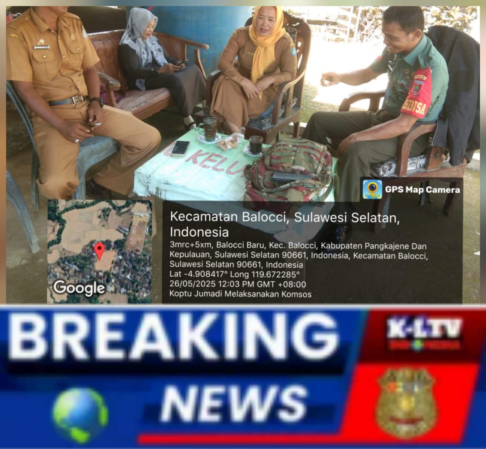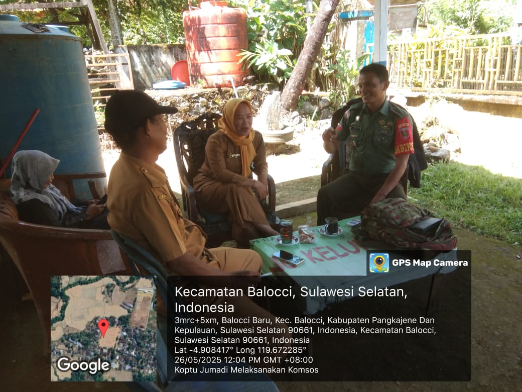 klivetvindonesia.com, Pangkep, Senin 26 Mei 2025 — Dalam upaya mempererat sinergi dengan pemerintah setempat, Koptu Jumadi selaku Babinsa Kelurahan Balocci Baru melaksanakan Komunikasi Sosial (Komsos) bersama staf Kelurahan Balocci Baru yang bertempat di Kantor Kelurahan Balocci Baru, Kecamatan Balocci, Kabupaten Pangkep. Kegiatan ini berlangsung pada pukul 12.10 WITA.