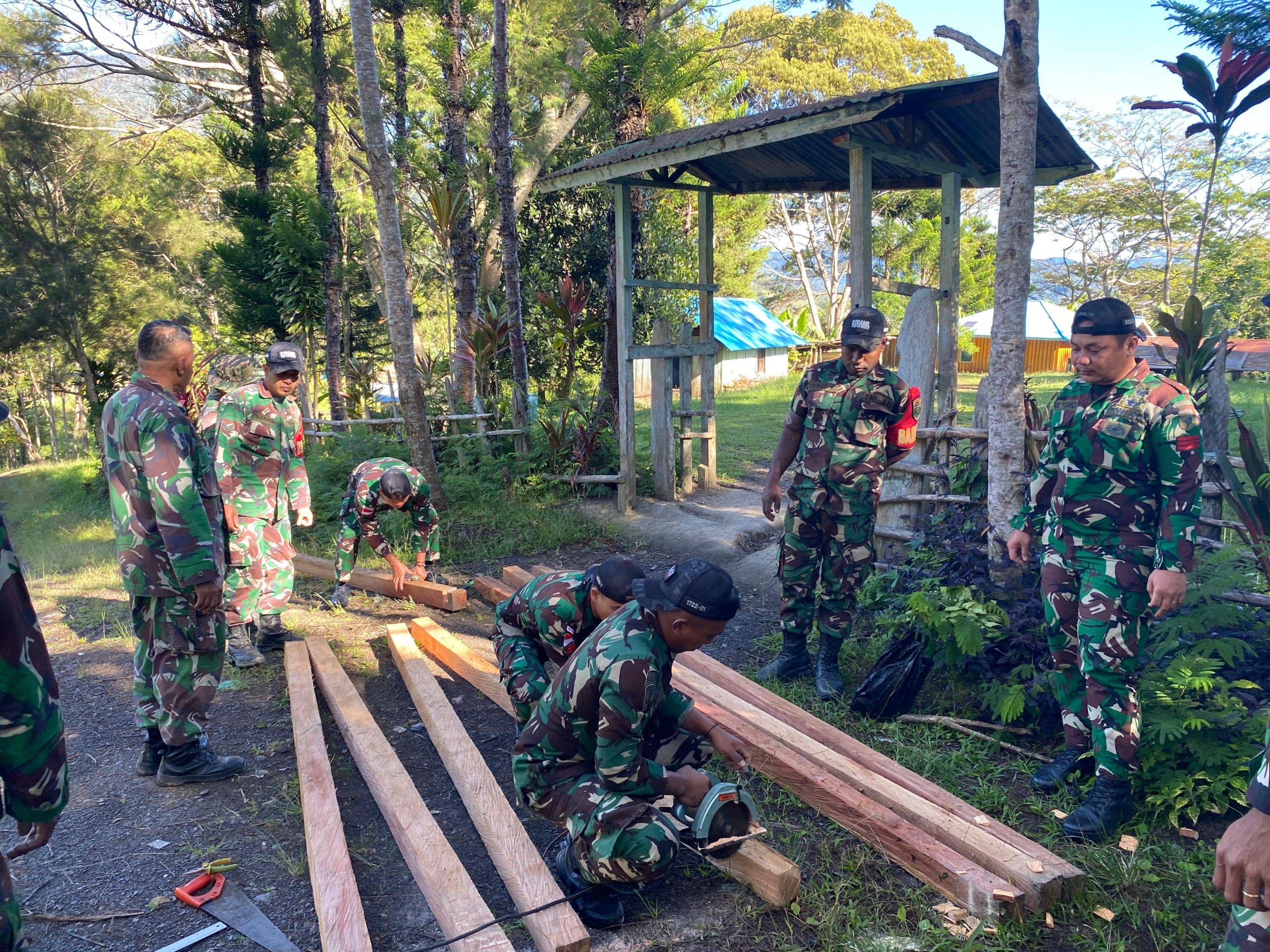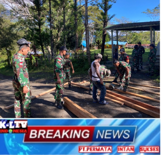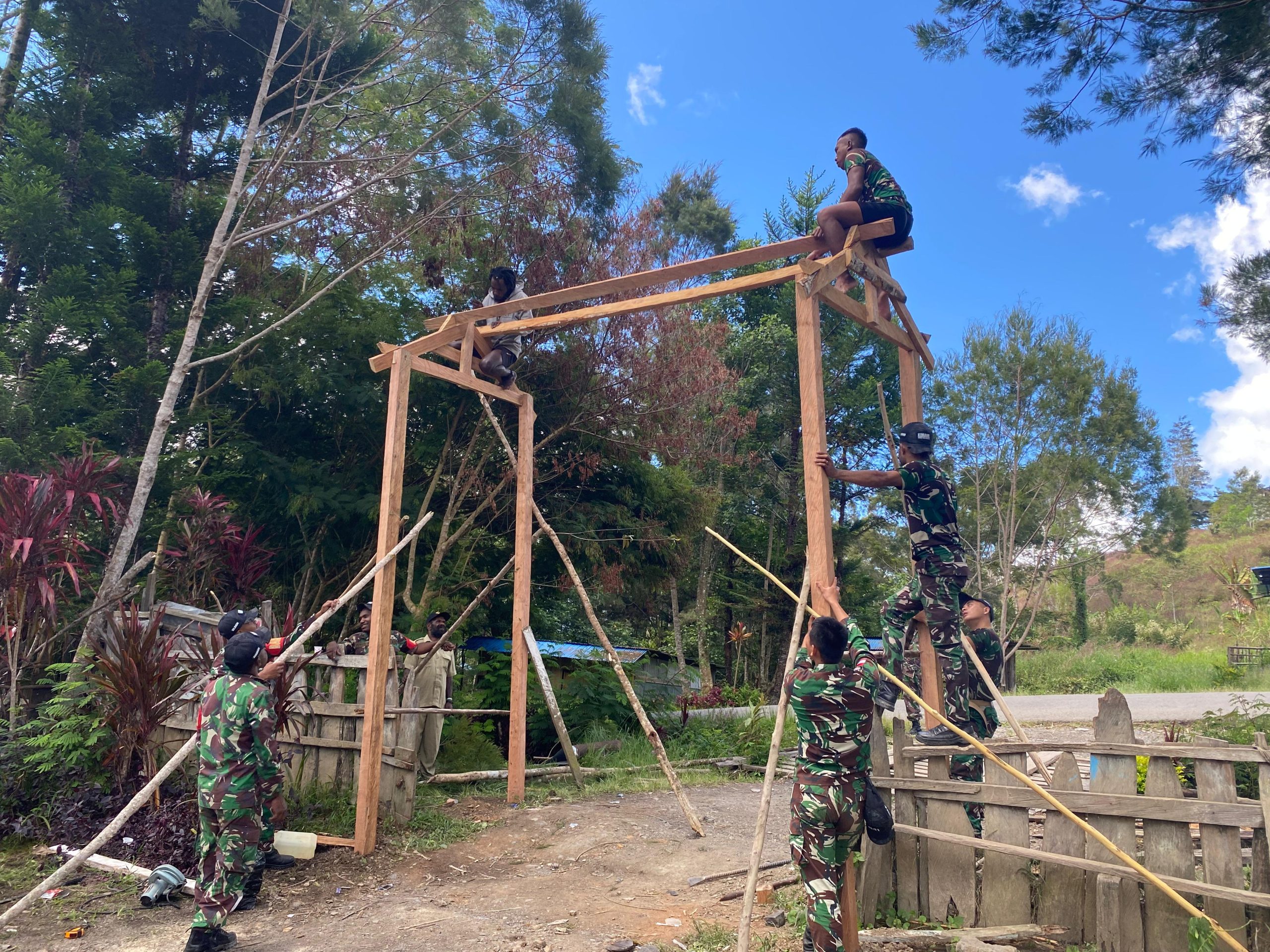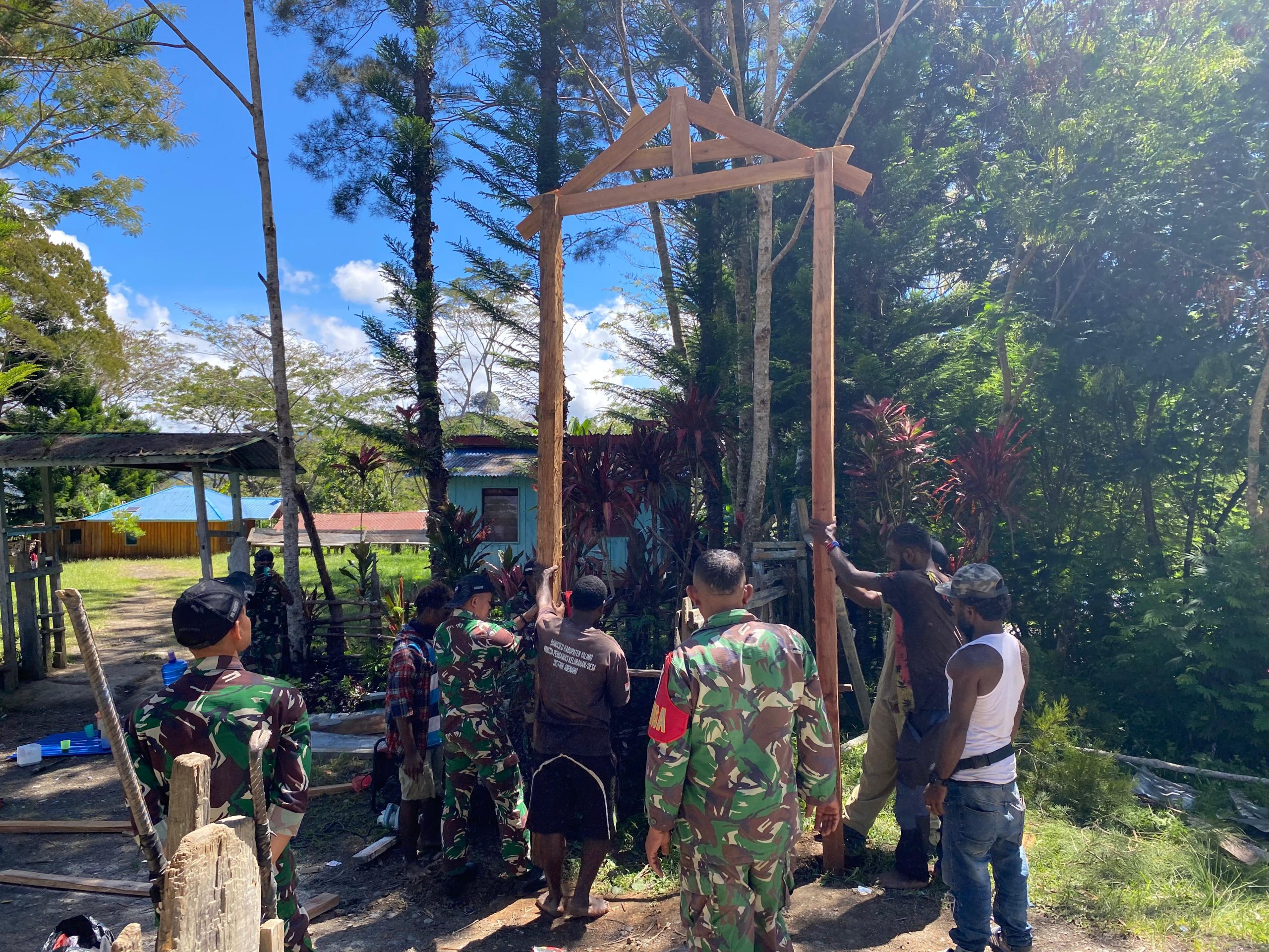 –klivetvindonesia.com– Membramo Tengah – Bentuk kekompakan TNI dan Masyarakat, melalui Satgas Yonif 641/Bru Pos Kelila bersama dengan anggota Koramil saling bahu-membahu membantu masyarakat perbaiki gerbang Desa Timeria, Distrik Kelila, Kabupaten Membramo Tengah, Provinsi Papua Pegunungan, (26/05/2025).