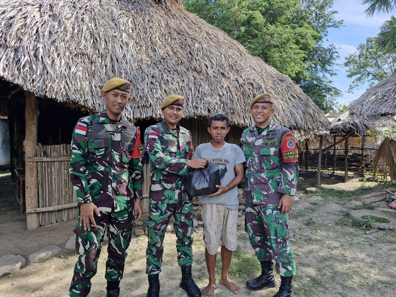Kupang, NTT – Wujud nyata kepedulian terhadap masyarakat perbatasan terus ditunjukkan oleh Satgas Pamtas RI–RDTL Sektor Barat Yonarhanud 15/DBY. Personel dari Mako Satgas bersama personel Pos Oepoli Tengah melaksanakan kegiatan pembagian bingkisan kepada warga yang membutuhkan di Desa Netemnanu Utara, Kecamatan Amfoang Timur, Kabupaten Kupang. (27/5)