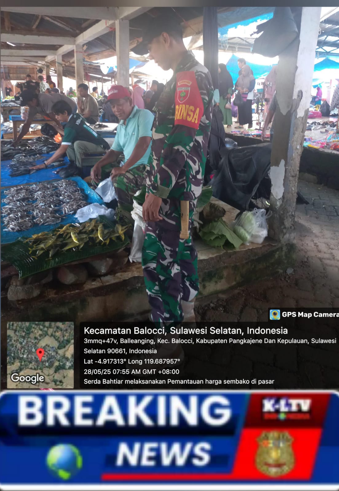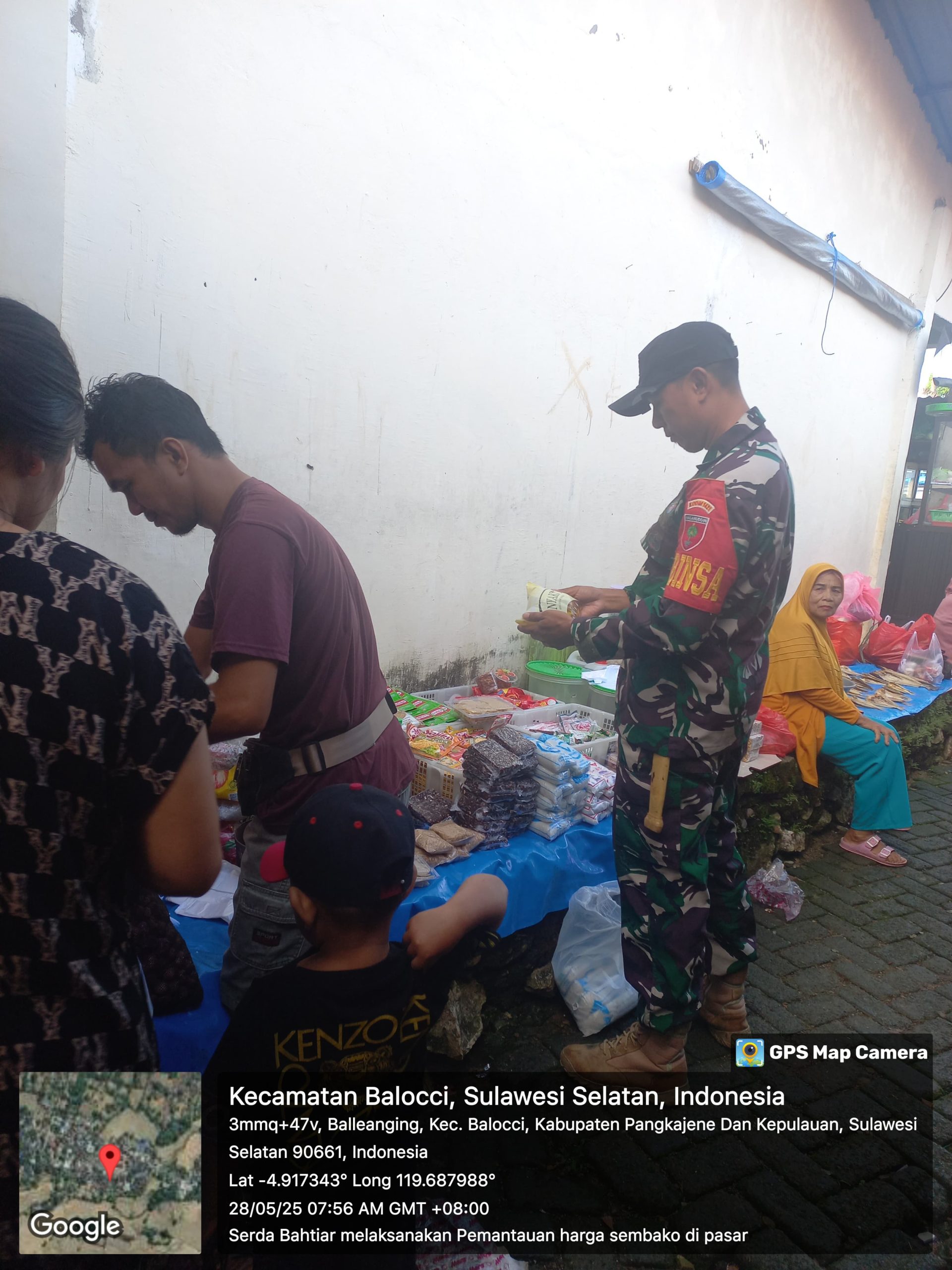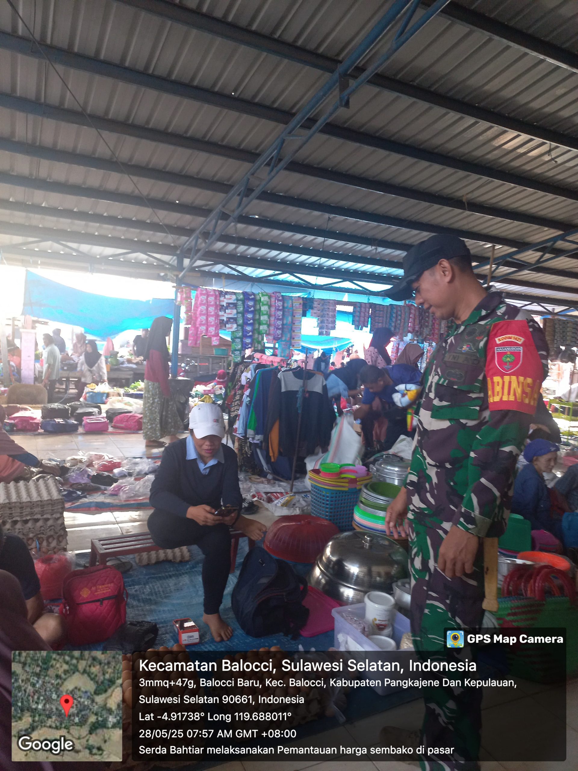 klivetvindonesia.com.Pangkep, 28 Mei 2025 — Dalam rangka memastikan stabilitas harga dan ketersediaan bahan kebutuhan pokok masyarakat, Babinsa Kelurahan Balleangin, Serda Bahtiar, melaksanakan kegiatan pemantauan harga jual beli bahan pokok di Pasar Tradisional Balleangin, Kecamatan Balocci, Kabupaten Pangkep, pada Selasa pagi, 28 Mei 2025 pukul 08.00 WITA.