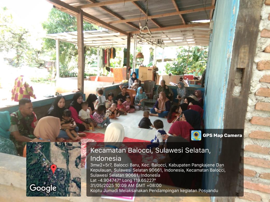 klivetvindonesia.com, Pangkep Sabtu, 31 Mei 2025 — Dalam upaya meningkatkan pemahaman masyarakat terhadap pentingnya kesehatan anak usia dini, khususnya balita, Babinsa Kelurahan Balocci Baru, Koptu Jumadi, turut hadir dan melaksanakan pendampingan kegiatan Penyuluhan Kesehatan Kelas Balita yang dilangsungkan di RW 003 RT 002, tepatnya di rumah Ibu Yunna yang berlokasi di samping Posyandu Anggrek 2, Kampung Sumpang Bita, Kelurahan Balocci Baru, Kecamatan Balocci, Kabupaten Pangkajene dan Kepulauan (Pangkep).