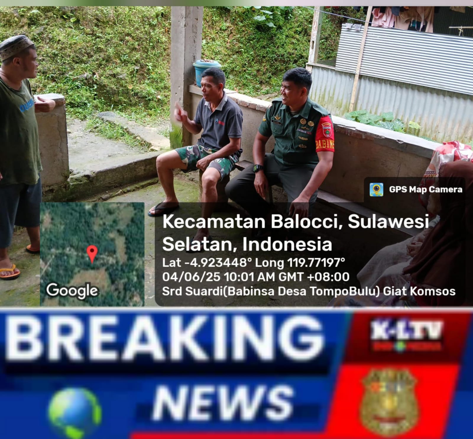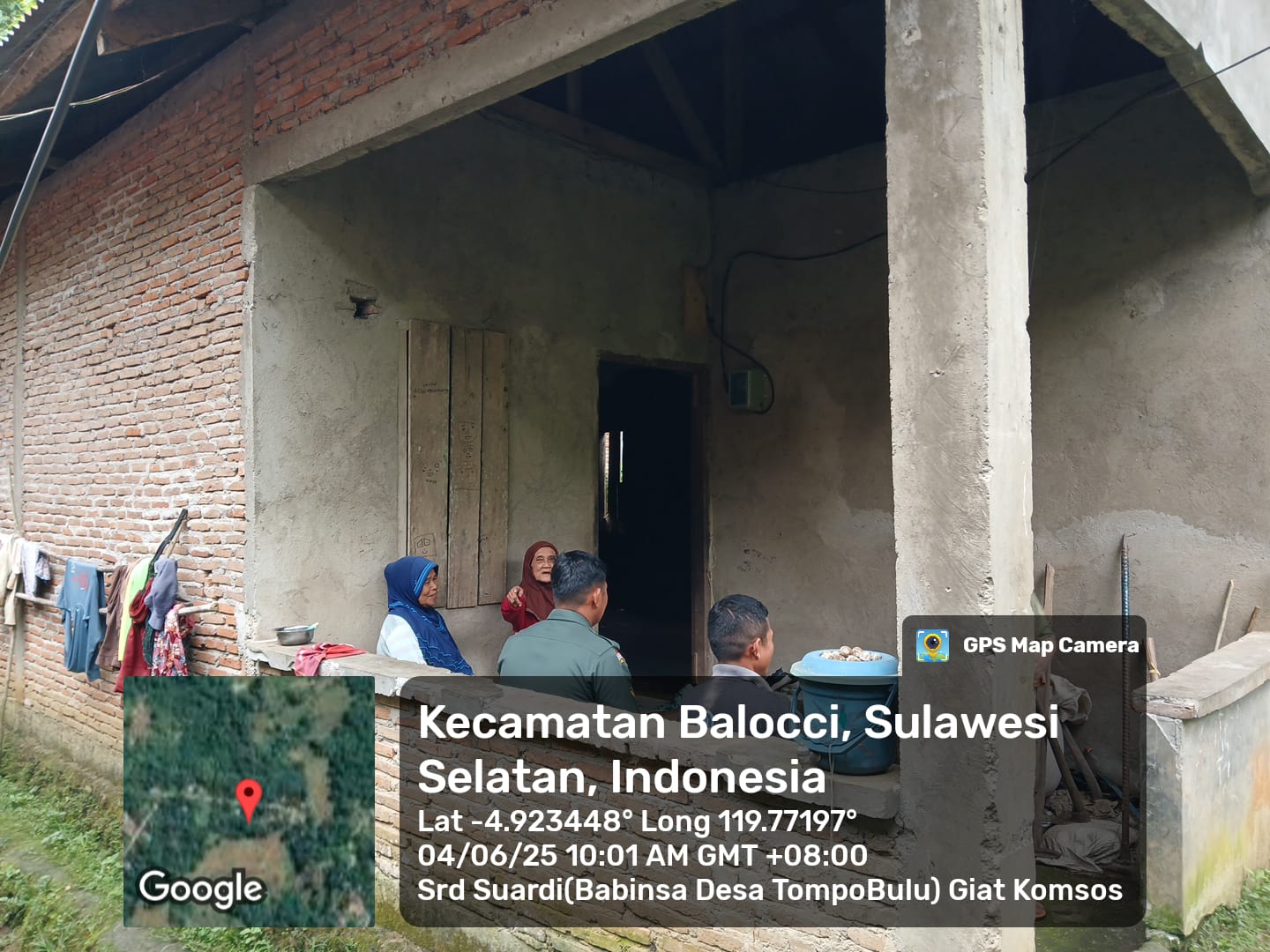 klivetvindonesia.com, Pangkep, 4 Juni 2025 – Dalam upaya memperkuat hubungan antara aparat TNI dan masyarakat serta menjaga situasi kamtibmas yang kondusif di wilayah binaannya, Babinsa Desa Tompo Bulu, Serda Suardi, melaksanakan kegiatan Komunikasi Sosial (KOMSOS) bersama warga setempat pada hari Rabu, 04 Juni 2025, pukul 09.45 Wita. Kegiatan ini berlangsung di rumah salah satu warga, Bapak Shaleh, yang berlokasi di Kampung Dagallung, Dusun 01 Bulu-Bulu, Desa Tompo Bulu, Kecamatan Balocci, Kabupaten Pangkep.