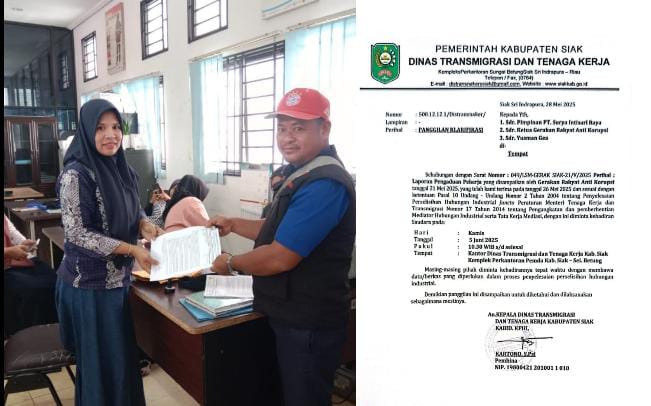 Pekerja dengan di dampingi oleh Agus zega sebagai ketua LSM Gerak Siak (gerakan rakyat Anti korupsi kabupaten Siak, Mendatangi kantor Dinas tenaga kerja dan transmigrasi kabupaten Siak melaporkan hal yang di alami oleh pekerja,Pihak Distransnaker Siak merespon dengan melayangkan surat krarifikasi dengan di panggil pihak perusahaan sesuai jadwal 05/6/25. Pihak perusahaan tak hadir dengan alasan sakit ucap Distransnaker Siak di tanda Minggu depan tegasnya.