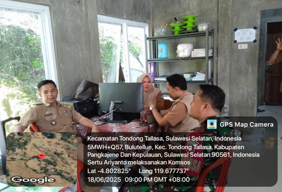 klivetvindonesia.com, Pangkep, 18 Juni 2025 Dalam rangka mempererat koordinasi dan sinergi antara aparat teritorial dengan pemerintah desa serta penyuluh pertanian, Babinsa Desa Bulu Tellue, Sertu Ariyanto, melaksanakan kegiatan komunikasi sosial (komsos) pada rabu pagi, pukul 09.00 WITA. Kegiatan ini berlangsung di Kantor Desa Bulu Tellue, Kecamatan Tondong Tallasa, Kabupaten Pangkep, dan dihadiri oleh Kepala Desa Bulu Tellue, Heriadi, S.Sos serta Penyuluh Pertanian Lapangan (PPL), Husain, S.P.