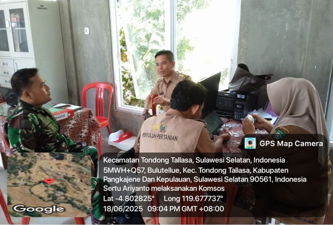 klivetvindonesia.com, Pangkep, rabu 18 Juni 2025 Dalam rangka mempererat koordinasi dan sinergi antara aparat teritorial dengan pemerintah desa serta penyuluh pertanian, Babinsa Desa Bulu Tellue, Sertu Ariyanto, melaksanakan kegiatan komunikasi sosial (komsos) pada Rabu pagi, pukul 09.00 WITA. Kegiatan ini berlangsung di Kantor Desa Bulu Tellue, Kecamatan Tondong Tallasa, Kabupaten Pangkep, dan dihadiri oleh Kepala Desa Bulu Tellue, Heriadi, S.Sos serta Penyuluh Pertanian Lapangan (PPL), Husain, S.P.