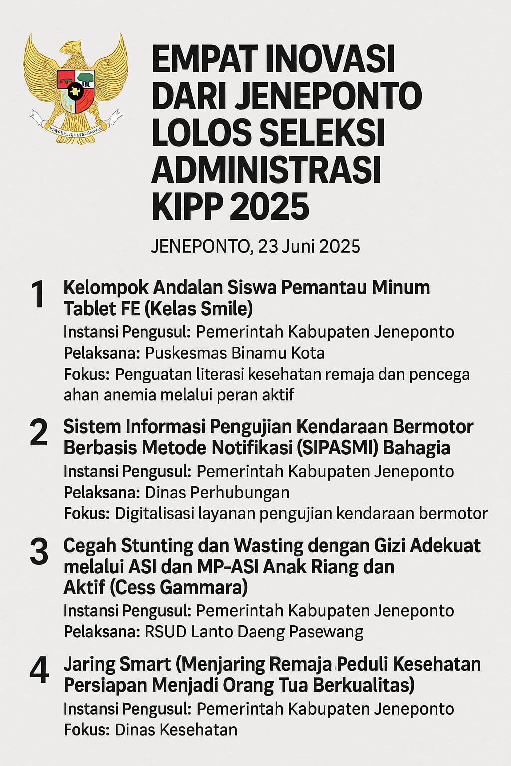 klivetvindonesia.com, JENEPONTO, 23 Juni 2025 — Kabupaten Jeneponto kembali menorehkan capaian membanggakan di tingkat nasional. Empat inovasi pelayanan publik yang diusulkan oleh sejumlah perangkat daerah dinyatakan lolos seleksi administrasi Kompetisi Inovasi Pelayanan Publik (KIPP) Tahun 2025, sebagaimana diumumkan oleh Kementerian Pendayagunaan Aparatur Negara dan Reformasi Birokrasi (Kemenpan RB) melalui surat resmi bernomor B/174/PP.00.05/2025 tertanggal 23 Juni 2025.