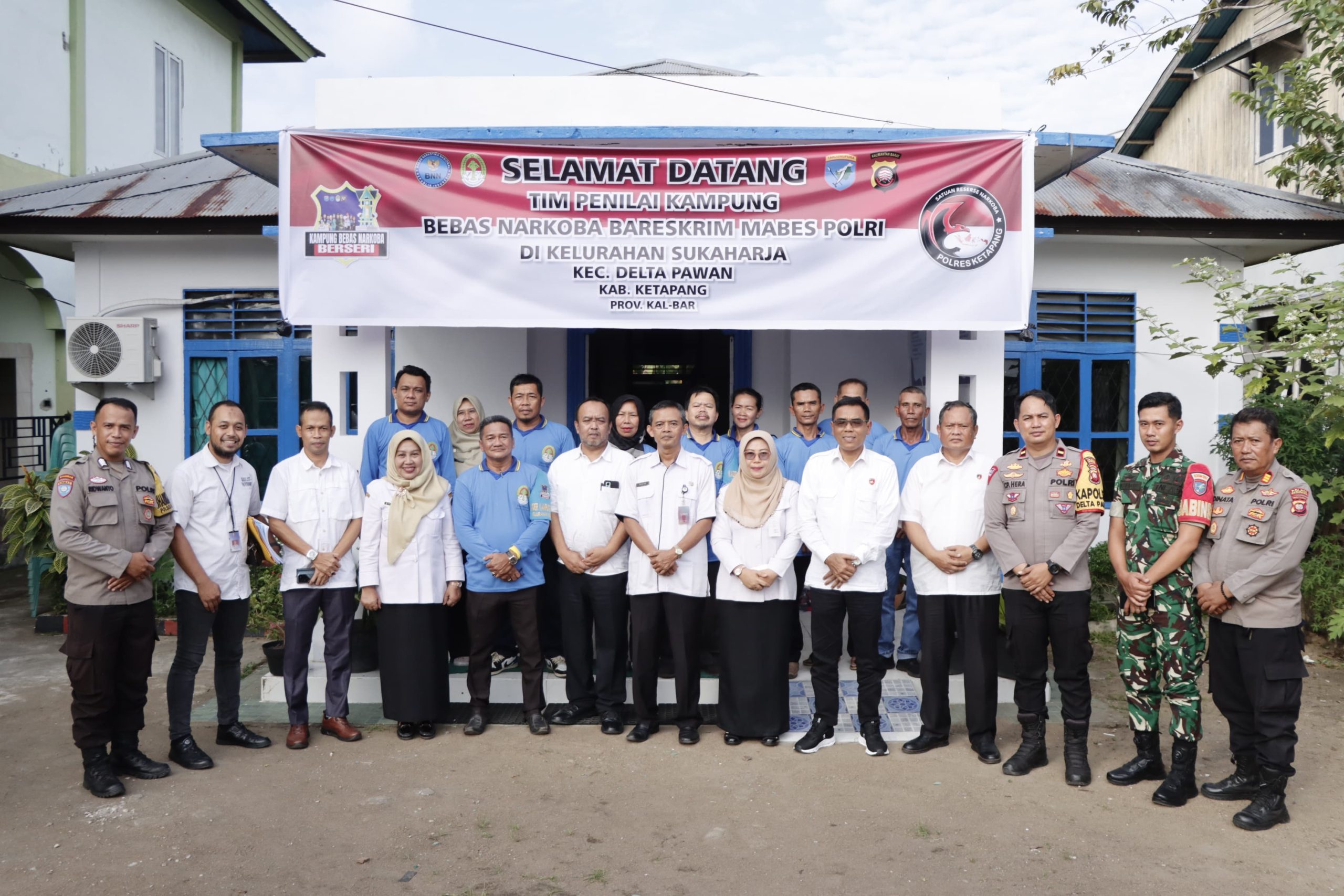 Rombongan tim Bareskrim Mabes Polri yang dipimpin oleh Kombes Pol. Khamdani, S.Sos., disambut langsung oleh Kapolres Ketapang AKBP Setiadi, S,H., S.I.K., M.H., bersama Kasat Narkoba AKP Aris Pramudji Widodo, S.A.P., dan jajaran pejabat Utama Polres Ketapang. Selain itu tim penilai juga disambut Kepala Bidang Kesbangpol Ketapang Ibu Yulia Ningsih, S.K.M., M.Sos., Camat Delta Pawan Drs. Sudarto., Sekcam Delta Pawan Ibu Hj. Budi Rahayu, S.IP.., Kapolsek Delta Pawan IPDA Chepry Perahera, S.H., Lurah Sukaharja Bapak Darno, S.E., tokoh masyarakat, dan perwakilan warga setempat. Suasana penyambutan berlangsung hangat dan penuh antusiasme, menandakan kuatnya sinergi antara aparatur pemerintahan dan masyarakat dalam memberantas peredaran narkoba.