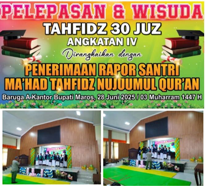 –klivetvindonesia.com– Suasana haru dan penuh kebanggaan menyelimuti Baruga A Kantor Bupati Maros pada Sabtu pagi, 28 Juni 2025, saat puluhan santri Ma’had Tahfidz Nujuumul Qur’an resmi dilepas dan diwisuda. Momen istimewa ini dirangkaikan dengan penerimaan rapor santri, sekaligus menjadi selebrasi khidmat bagi santri-santri penghafal 30 juz Al-Qur’an angkatan ke-VI.