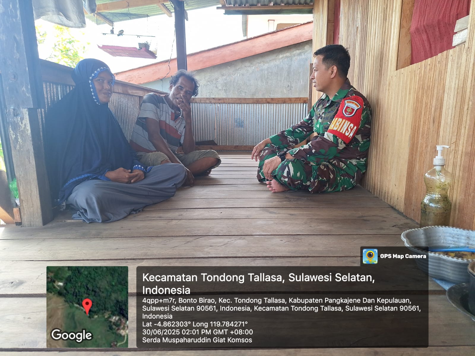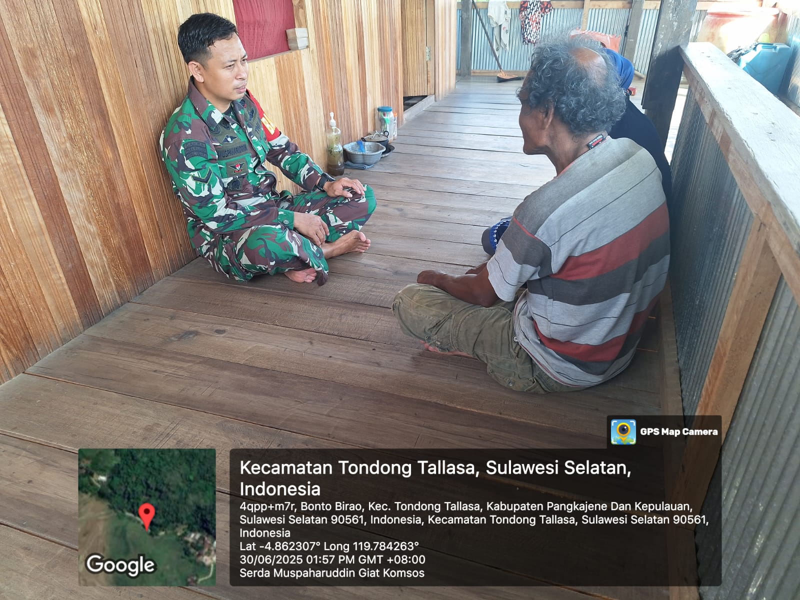 klivetvindonesia.com, Pangkep, 30 Juni 2025 – Dalam rangka mempererat hubungan dengan masyarakat serta meningkatkan kesadaran warga terhadap pentingnya kebersihan lingkungan dan keamanan rumah, Babinsa Desa Bonto Birao, Serda Muspaharuddin, kembali turun langsung ke tengah-tengah warga binaannya. Pada Senin, 30 Juni 2025 pukul 13.15 Wita, ia melaksanakan kegiatan Komunikasi Sosial (Komsos) di Kampung Bonto, Desa Bonto Birao, Kecamatan Tondong Tallasa, Kabupaten Pangkep.