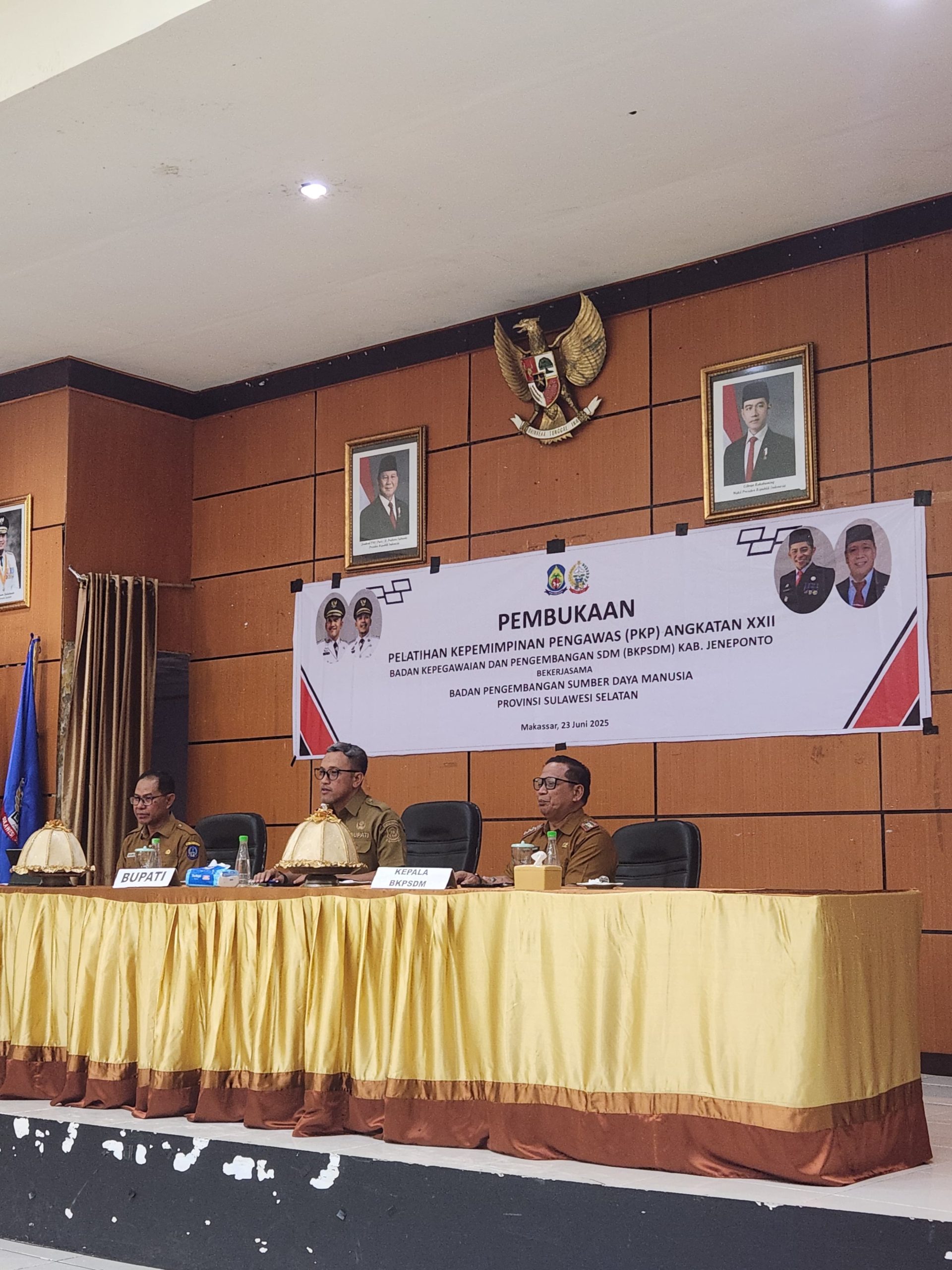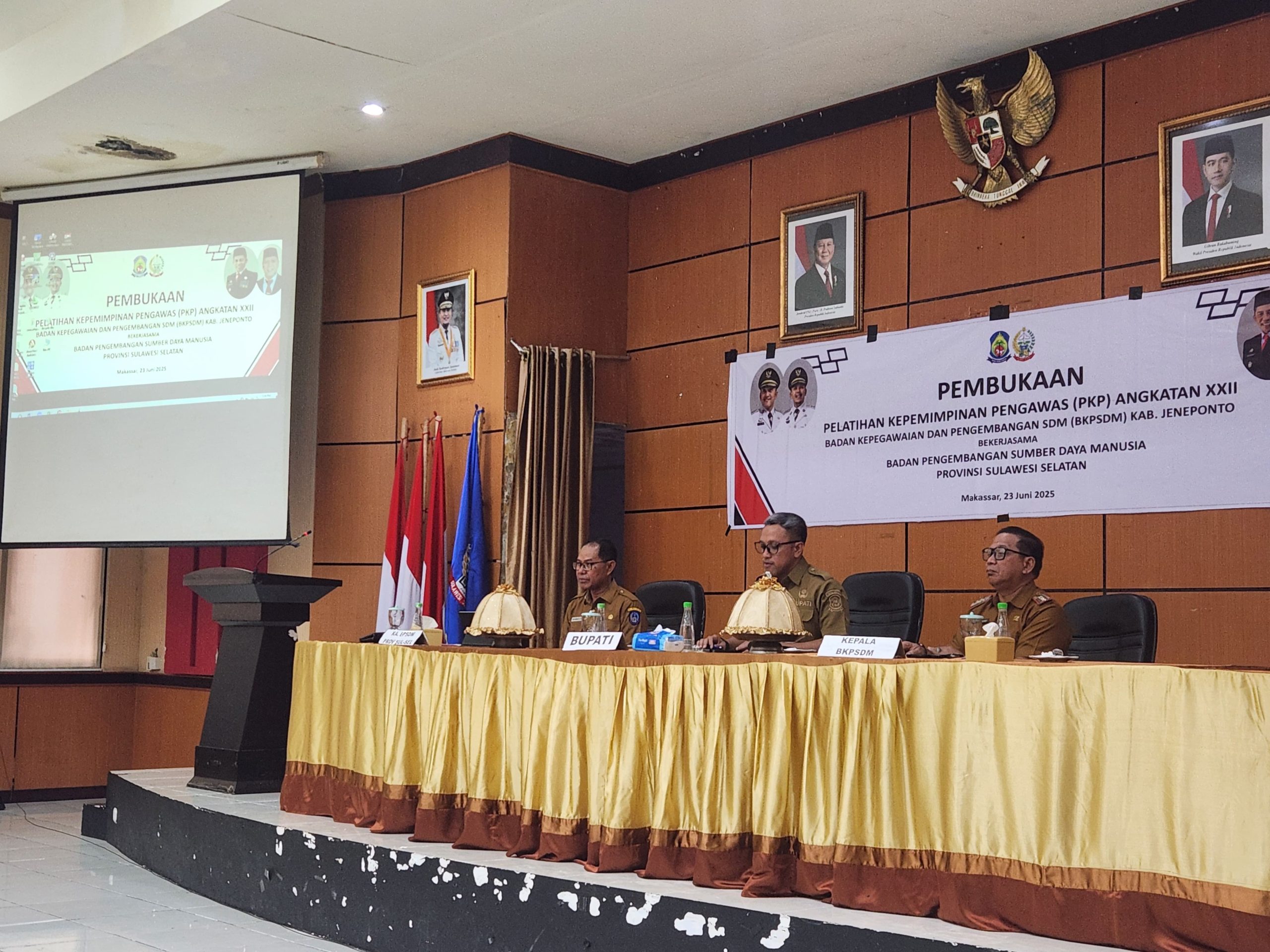 Pemerintah Kabupaten Jeneponto bersama Pemerintah Provinsi Sulawesi Selatan menggelar Pelatihan Kepemimpinan Pengawas (PKP) Angkatan XXII Tahun 2025 di Kampus I Badan Pengembangan Sumber Daya Manusia (BPSDM) Provinsi Sulsel, Jalan Sultan Alauddin, Makassar.