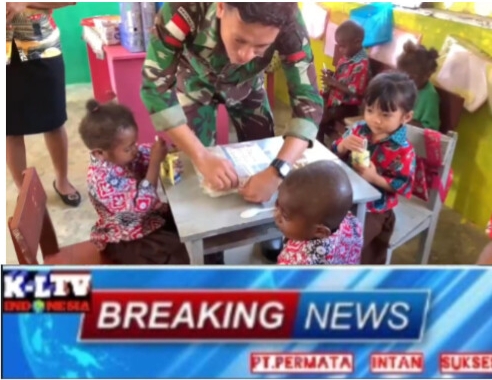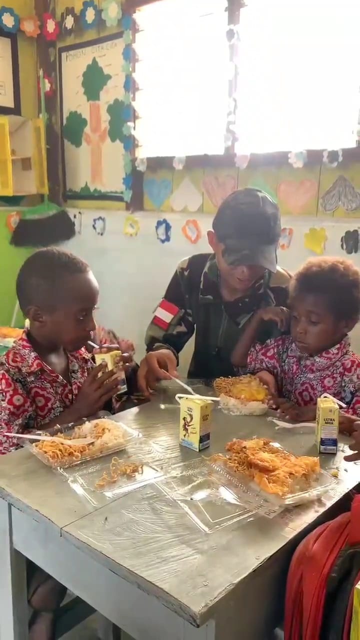 Klivetvindonesia.com-Teluk Bintun Pembinaan teritorial terus dilakukan oleh Satgas Pamtas Kewilayahan RI-PNG Yonif 642/Kps, melalui Pos Jagiro. Pembagian makan gratis untuk siswa siswi TK medario kampung Jagiro, Distrik. Moskona Selatan Kabupaten Teluk Bintuni Provinsi Papua Barat. (5/7).