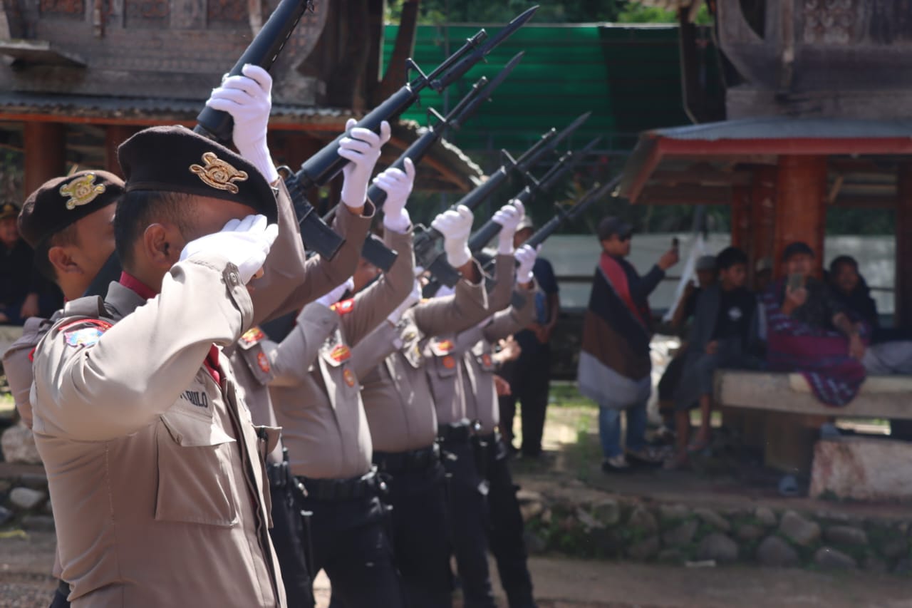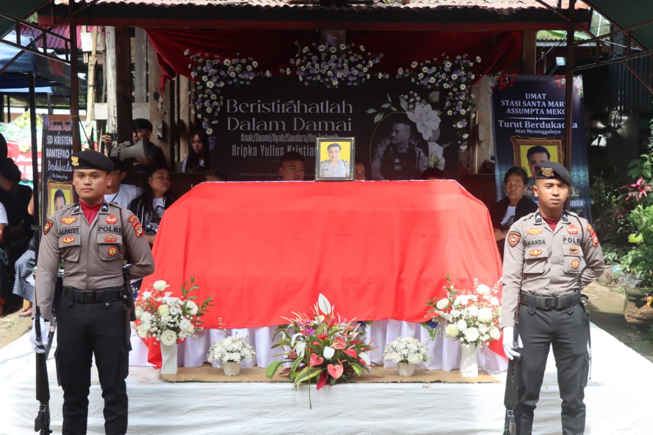 Kepolisan Resor Toraja Utara Polda Sulsel menggelar Upacara Persemayaman Jenazah Almarhum Bripka Yulius Kristian Ramba secara dinas Kepolisian bertempat di Tongkonan Karambe, Rinding Batu, Kesu, Toraja Utara, Kamis (03/07/2025).