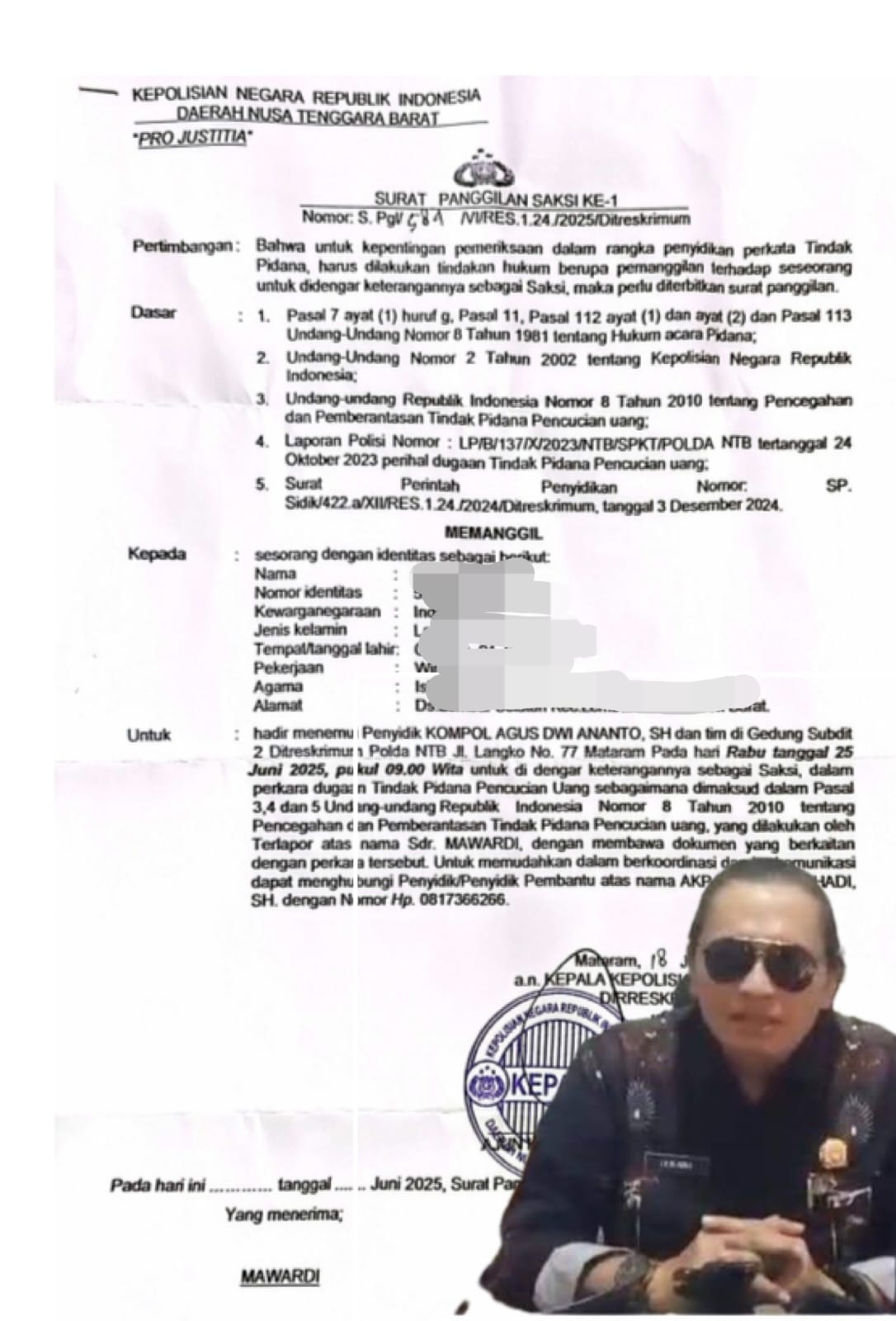 Yang paling mengundang pertanyaan adalah surat panggilan yang diterima Mawardi pada Juni 2025, di mana dia dipanggil sebagai “saksi” dalam perkara TPPU dengan nomor LP/B/137/X/2023/NTB/SPKT.