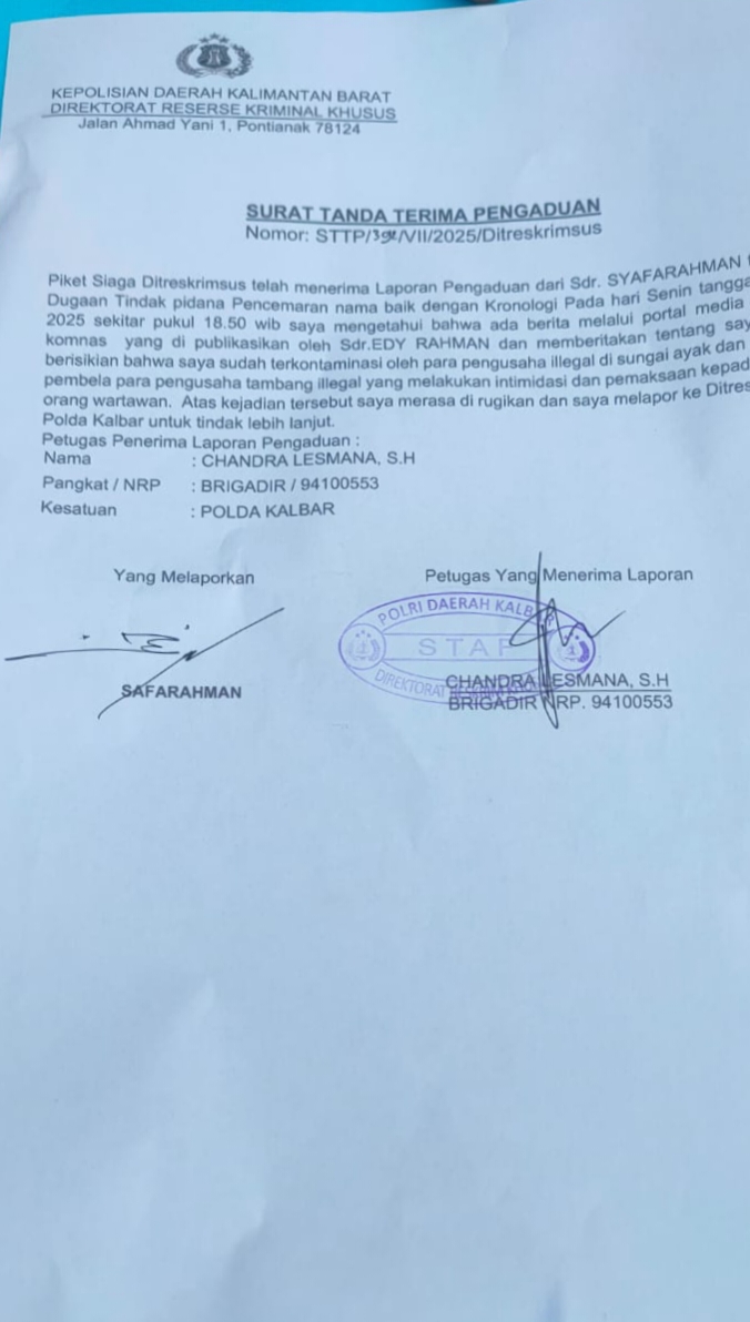 Syafarahman datang langsung ke Polda Kalbar didampingi kuasa hukumnya Asido Jamot Tua Simbolon S.H, Untuk membuat laporan resmi beserta bukti awal yang dimiliki. Laporan tersebut telah diterima pihak kepolisian dan tercatat dengan nomor: STTP/392/Vll/2025/Ditreskrimsus Polda Kalbar..
