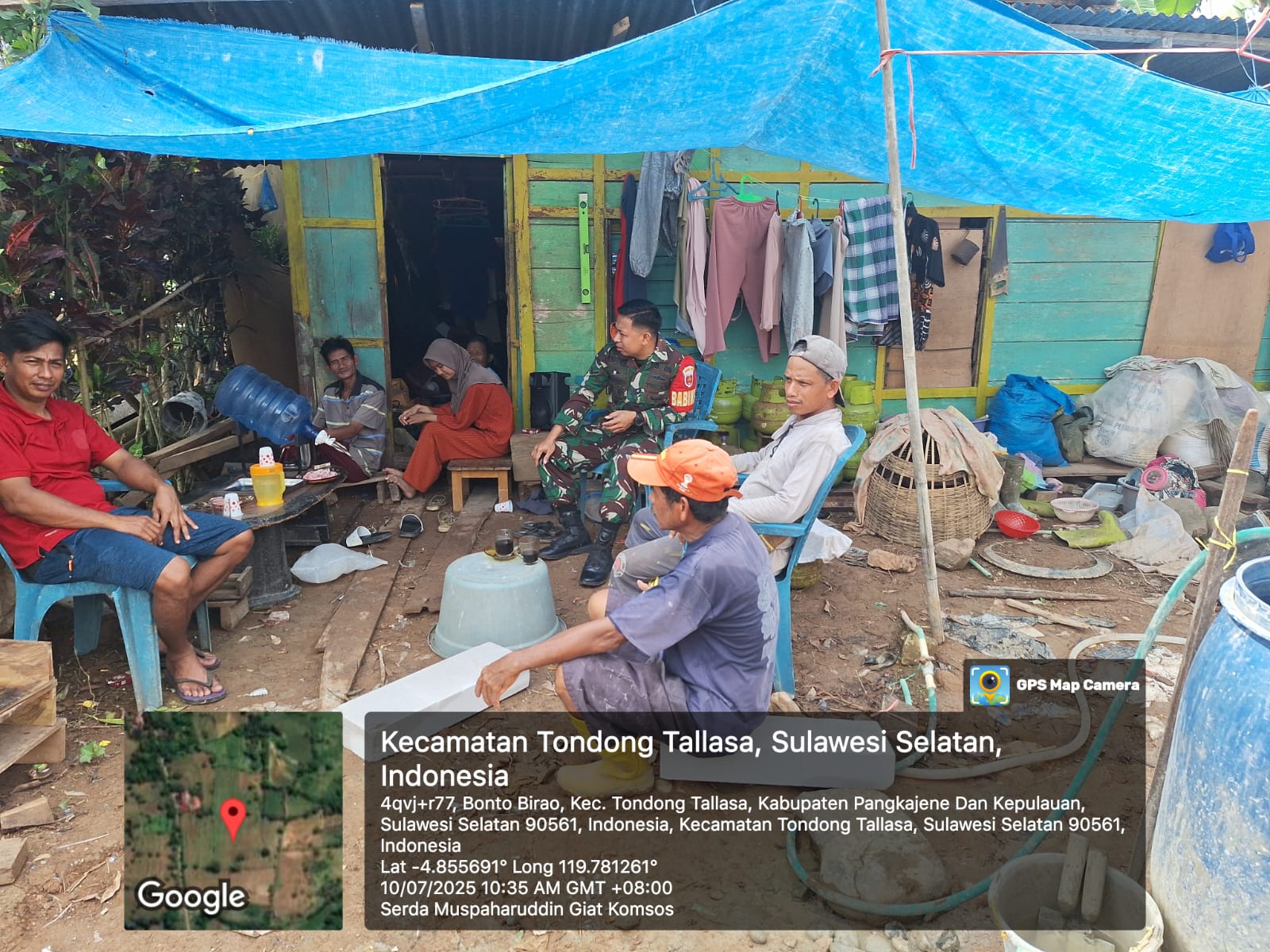 klivetvindonesia.com, Pangkep, Tondong Tallasa – Dalam upaya memperkuat kemanunggalan TNI dengan rakyat serta membina ketahanan wilayah di tingkat desa, Babinsa Desa Bonto Birao, Serda Muspaharuddin, kembali melaksanakan kegiatan Komunikasi Sosial (Komsos) bersama warga Dusun Bonto, Desa Bonto Birao, Kecamatan Tondong Tallasa, Kabupaten Pangkep, pada Kamis (10/07/2025) sekitar pukul 09.30 WITA.