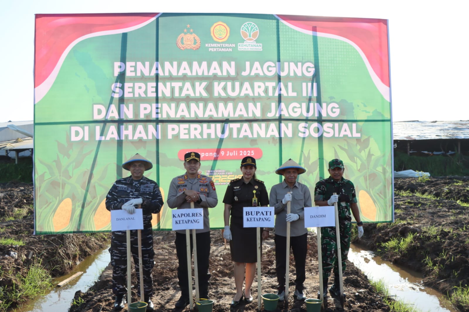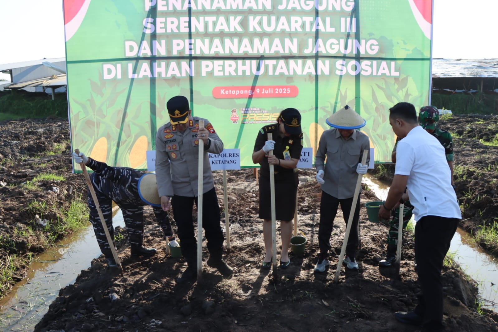 klivetvindonesia.com., Ketapang – Polda Kalbar, Kapolres Ketapang Polda Kalbar AKBP Setiadi, S.H., S.I.K., M.H., bersama jajaran forkopimda Kabupaten Ketapang melaksanakan penanaman bibit jagung serentak Kuartal III. Kegiatan penanaman bibit jagung tersebut digelar di area lahan Kawasan Industri Ketapang Ecology and Agriculture Forestry Industrial Park di Desa Sungai Awan Kanan Kecamatan Muara Pawan Kabupaten Ketapang, pada Rabu (09/07/2025) Pukul 14.00 Wib.