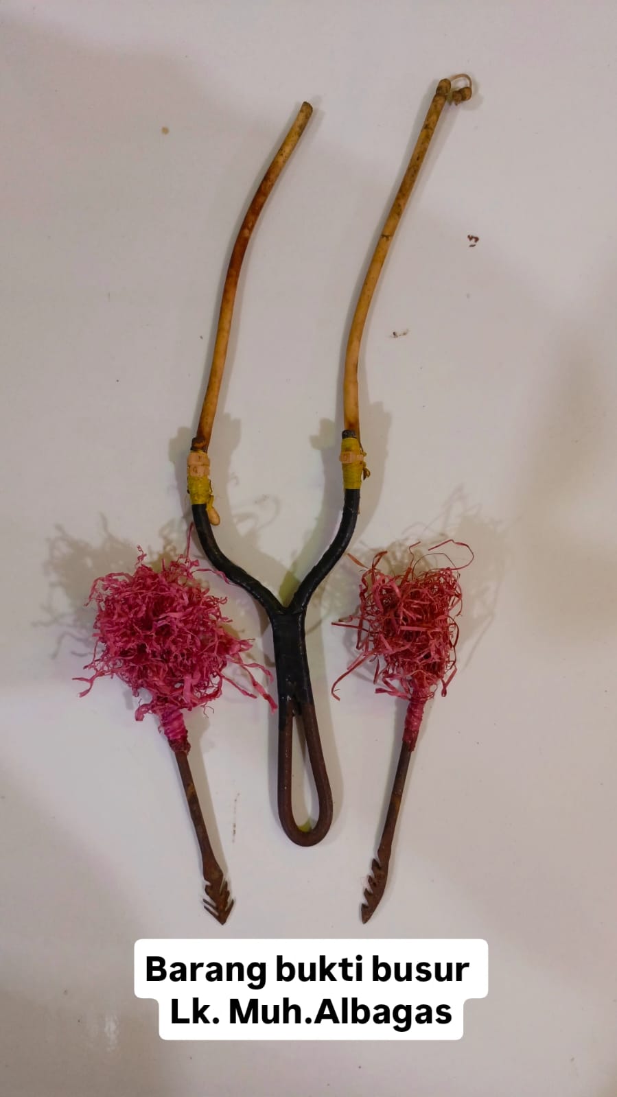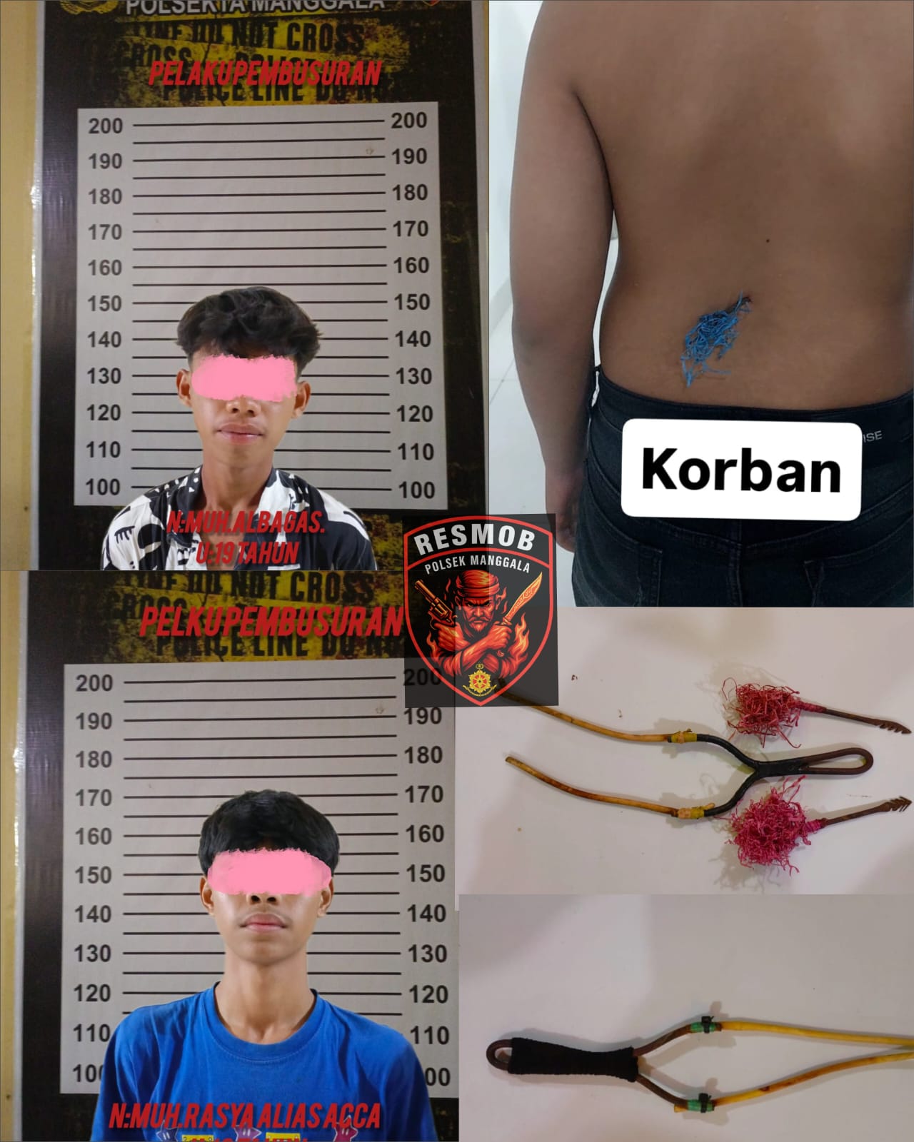 Berdasarkan laporan tersebut, tim opsnal melakukan penyelidikan dan berhasil melacak keberadaan para pelaku di rumah masing-masing. Saat dilakukan penggeledahan, petugas menemukan dua buah pangka pelontar dan dua anak panah busur yang disembunyikan di bawah lemari.