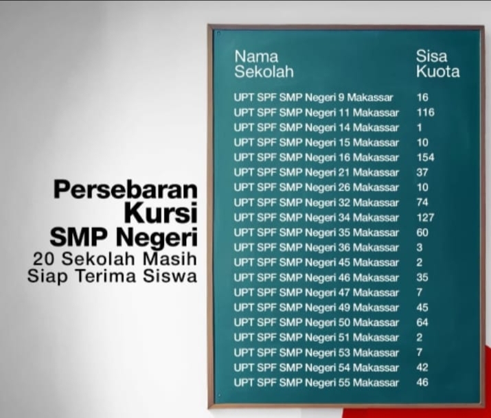 Melalui data resmi dari Dinas Pendidikan Kota Makassar, berikut sebaran sisa kuota di beberapa SMP Negeri yang masih membuka pendaftaran: