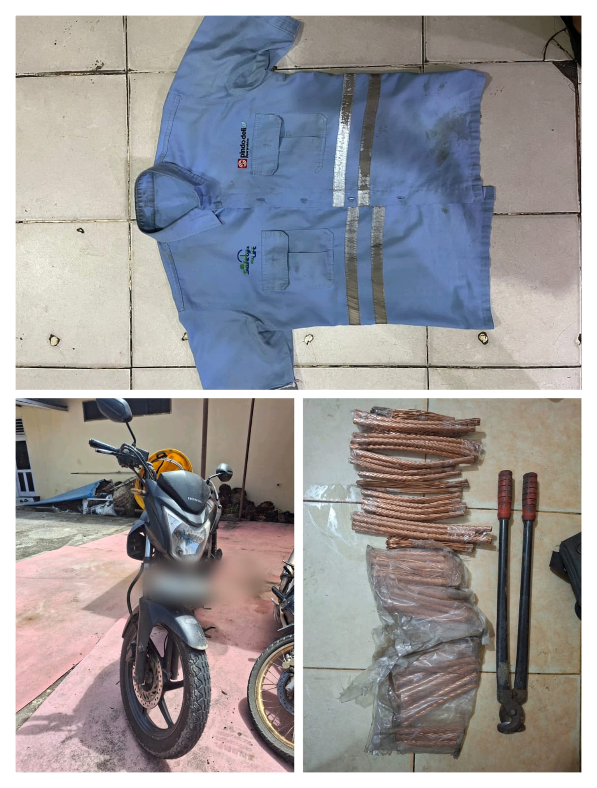Barang bukti yang diamankan dalam kasus ini meliputi 76 potong kabel tembaga, satu unit sepeda motor Honda Verza, satu gunting besi, pakaian kerja pelaku, serta helm warna kuning.