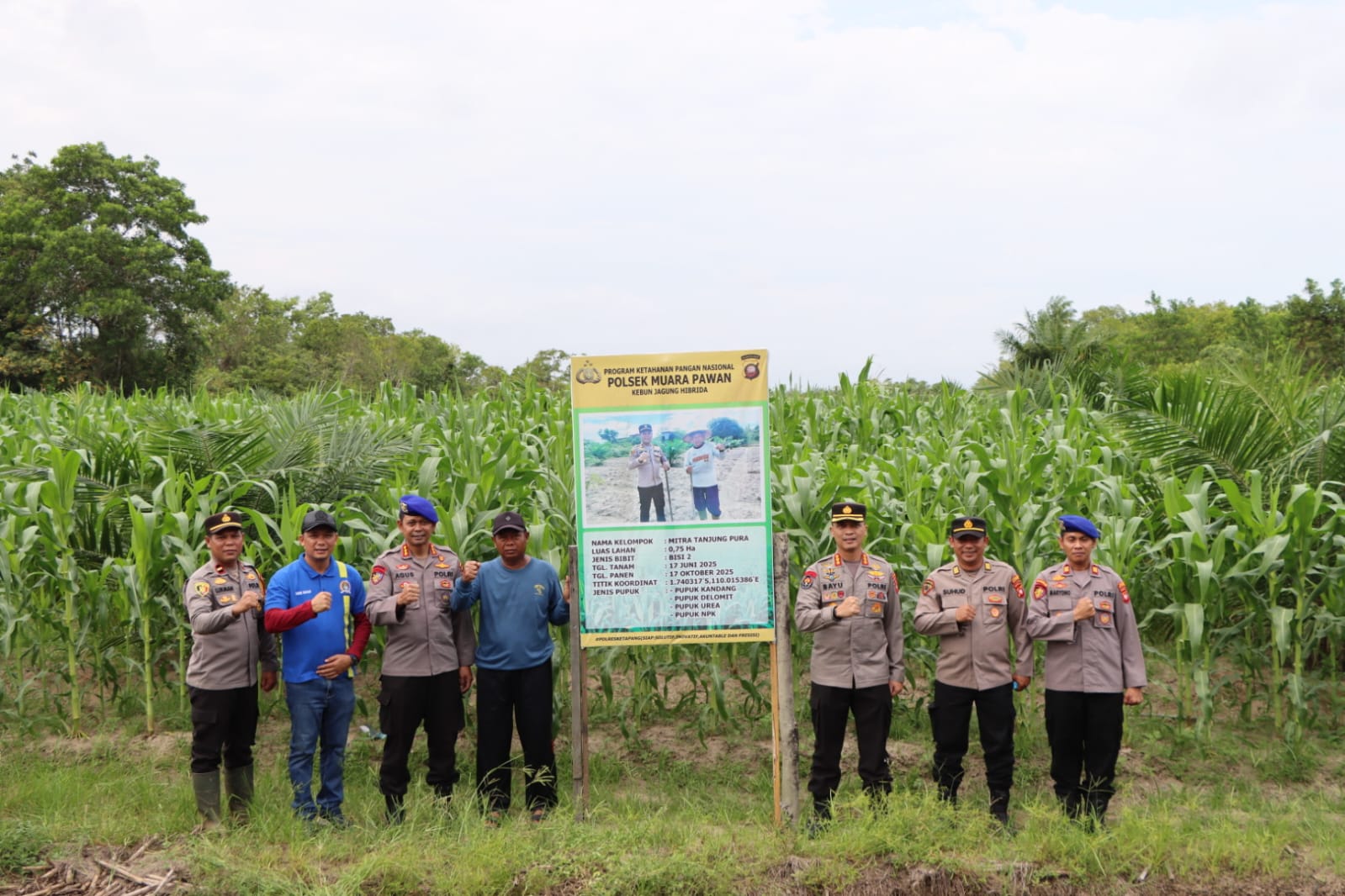 Dalam lawatan hari pertama ke wilayah Kabupaten Ketapang yaitu pada Jumat sore (01/07/2025), tim asistensi melakukan peninjauan lahan penanaman jagung di Kawasan Kantor Balai Penyuluhan Pertanian (BPP) di Kelurahan Tuan Tuan Kecamatan Benua Kayong Kabupaten Ketapang. Tim asistensi langsung memantau kondisi lahan penanaman jagung yang diinisiasi Polsek Benua Kayong bersama kelompok Tani jaya Makmur. Kegiatan tersebut juga dimanfaatkan tim asistensi untuk berdialog bersama kelompok Tani Jaya Makmur Kelurahan Tuan Tuan mengenai luasan lahan jagung yang sudah ditanami serta progress pertumbuhan tanaman jagung.